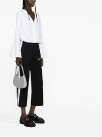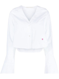 flute-sleeves cropped cotton shirt Palm Angels completely reinvents the classic white cotton shirt with this silhouette, displaying the brand's fusion of Italian flair and American streetwear. The design boasts a loose cropped fit, and is finished with playful fluted sleeves with tied cuffs. Made in Italy Composition Metal 100%, Cotton 100% SIZE & FIT Model measurements Height 5 ft 10 in(1.79 m) Bust/Chest 31.1 in(79 cm) Hips 35.03 in(89 cm) Waist 24.01 in(61 cm) FittingInformation This piece fits true to size. We recommend you get your regular size Cut for a loose fit Made with a mid-weight non-stretch fabric Washing instructions Machine Wash