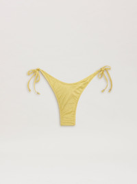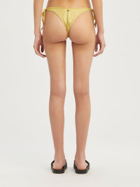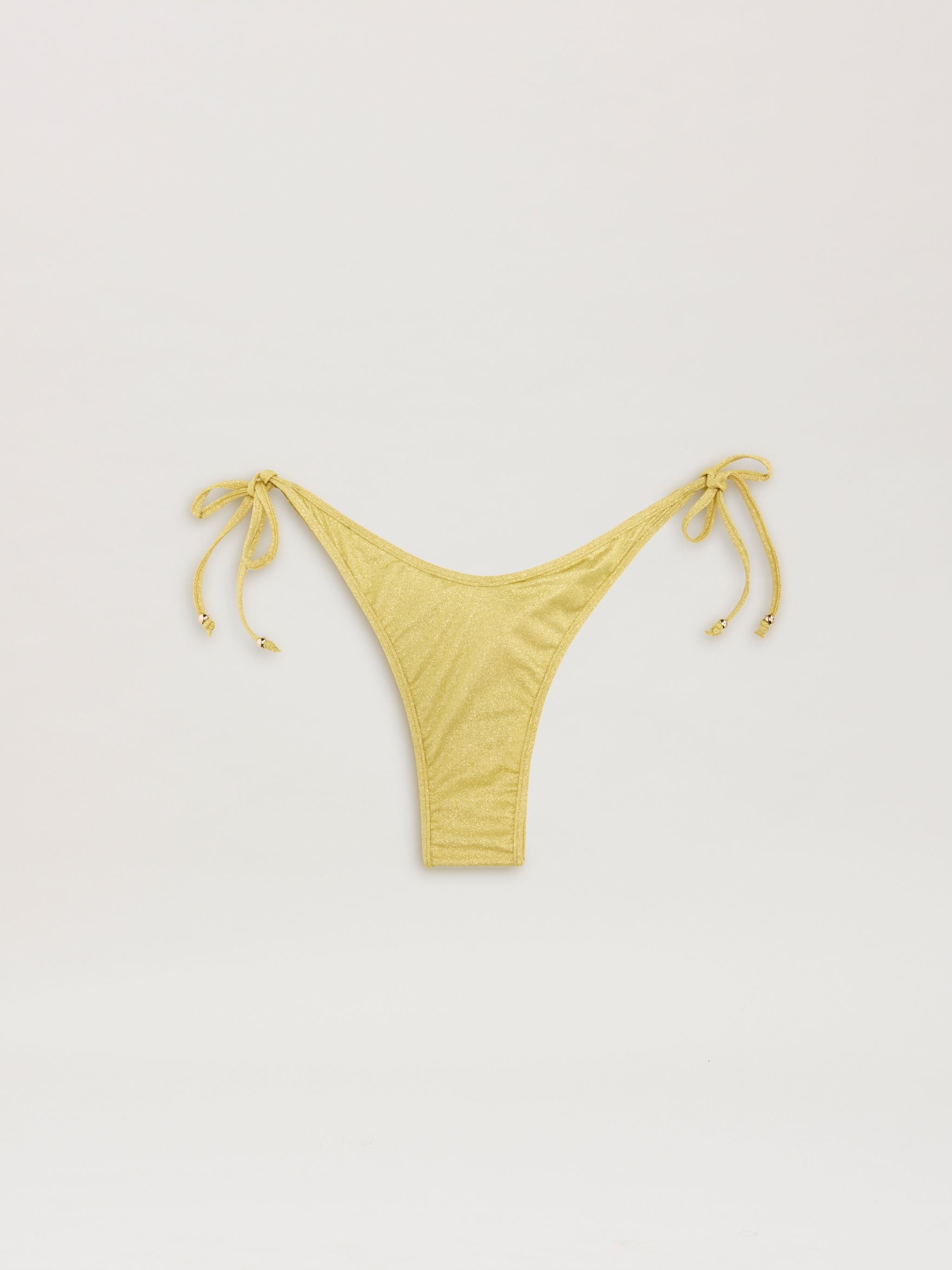 High-leg bikini bottom in golden glitter with laces on the hips, golden rings at the knots and a golden metal little palm tree sewn on the back. Perfect for the summer at the seaside or in the pool. FABRIC 69% POLYAMIDE FIBER 19% ELASTANE 12% METALLIZED MODEL GABRIELLY WEARS SIZE S HEIGHT: 5’9" (179 CM) BUST: 31" (80 CM) WAIST: 24" (63 CM) HIPS: 35" (89 CM) PRODUCT ID: PWFG007E23FAB0011818