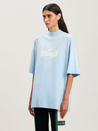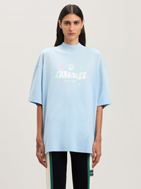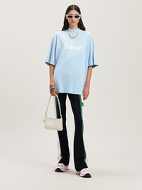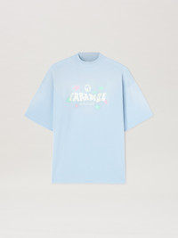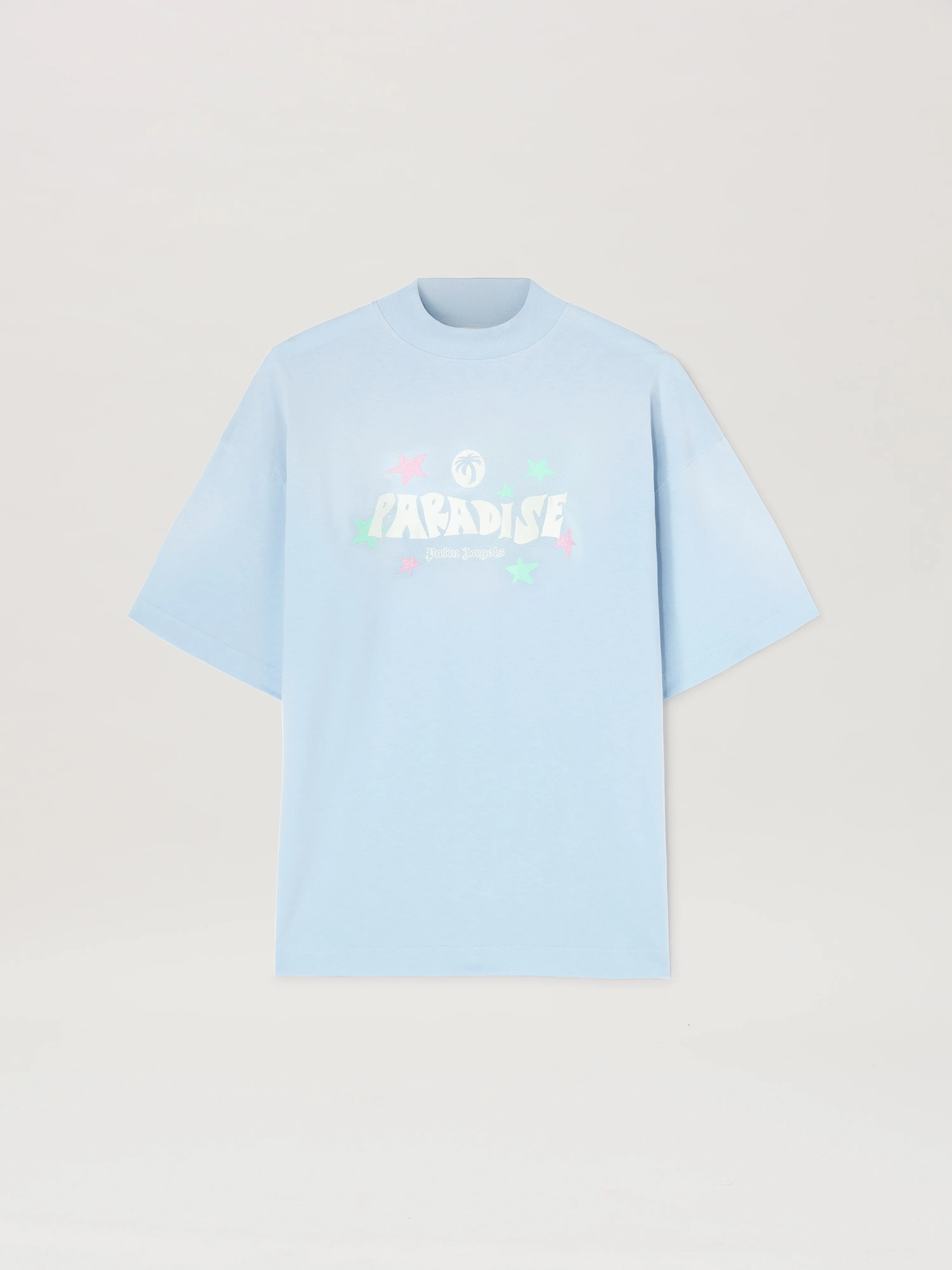 Tropical graphics, glitter details, 3D effects: exclusive SS25 season writings. Women's baby blue loose fit T-shirt with Paradise lettering printed in white with Oval Palm above and logo Palm Angels below, and pink and white glitter stars printed on front. DETAILS - Renda Wears Size S Height: 5’ 10” (179 Cm) Bust: 30” (77 Cm) Waist: 23” (60 Cm) Hips: 33” (85 Cm) Fabric 100% CottonRib Detail 100% Cotton - Code: PWAA017S25JER0014103