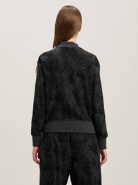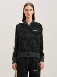 Palm trees blossom in a diversity of styles in the SS25. Women's black track jacket with all over pattern of jacquared palm trees and logo embroidered in white on front. DETAILS - Detail 100% PolyesterEmbroidery 100% PolyesterFabric 1 25% Polyester 75% CottonFabric 2 100% Polyester - Code: PWBD050S25FAB0011003