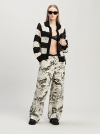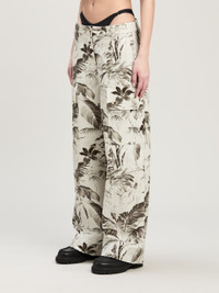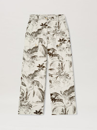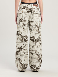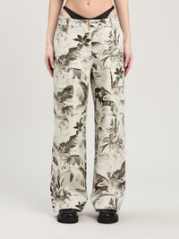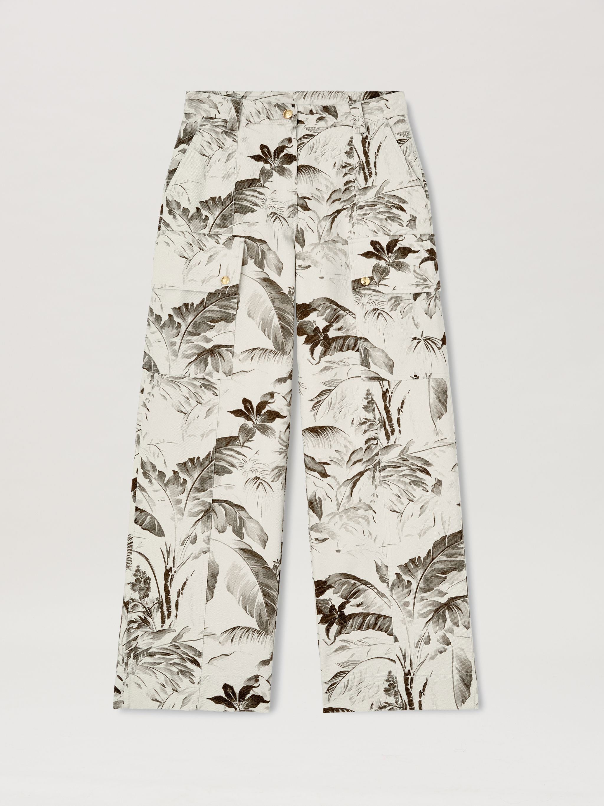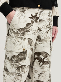 Tropic of white: bringing the ocean breeze into winter. Women's light beige jungle-print cargo pants featuring palm leaves and tropical flowers in military green, with side and back flap pockets closed by golden buttons and leather patch with Palm Angels logo engraved on the back. Ebba wears size 40 Height: 5' 10" (178 cm) Bust: 31" (79 cm) Waist: 23" (60 cm) Hips: 35" (89 cm) PRODUCT ID: PWCF014F24FAB0036156