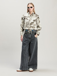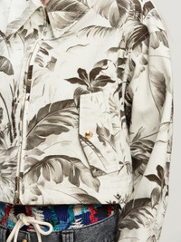 Tropic of white: bringing the ocean breeze into winter. Women's light beige jungle-print cropped jacket featuring palm leaves and tropical flowers in military green, with shirt collar and zip closure and leather patch with Palm Angels logo engraved on the back. Ebba wears size 40 Height: 5' 10" (178 cm) Bust: 31" (79 cm) Waist: 23" (60 cm) Hips: 35" (89 cm) PRODUCT ID: PWEA123F24FAB0016156