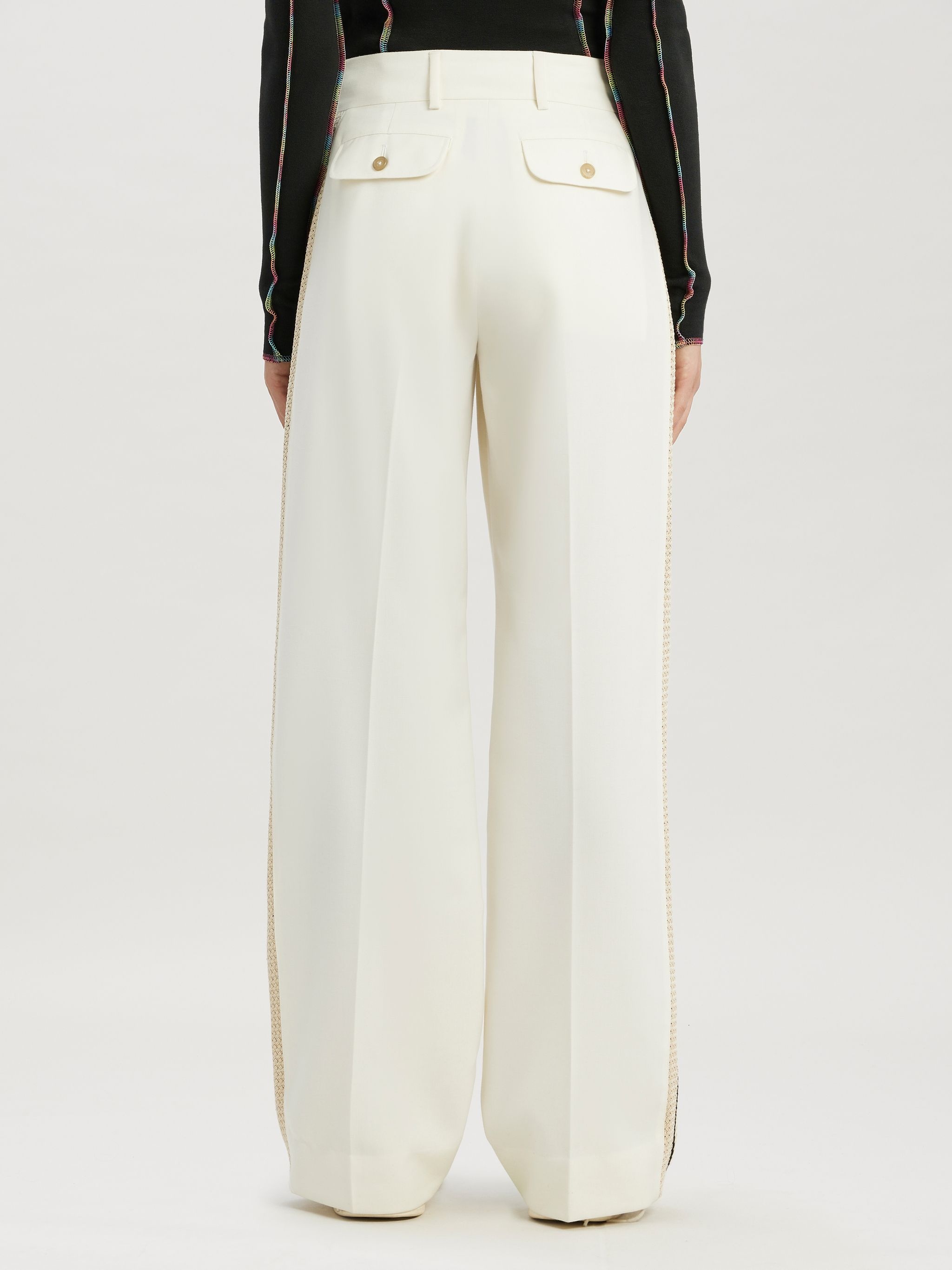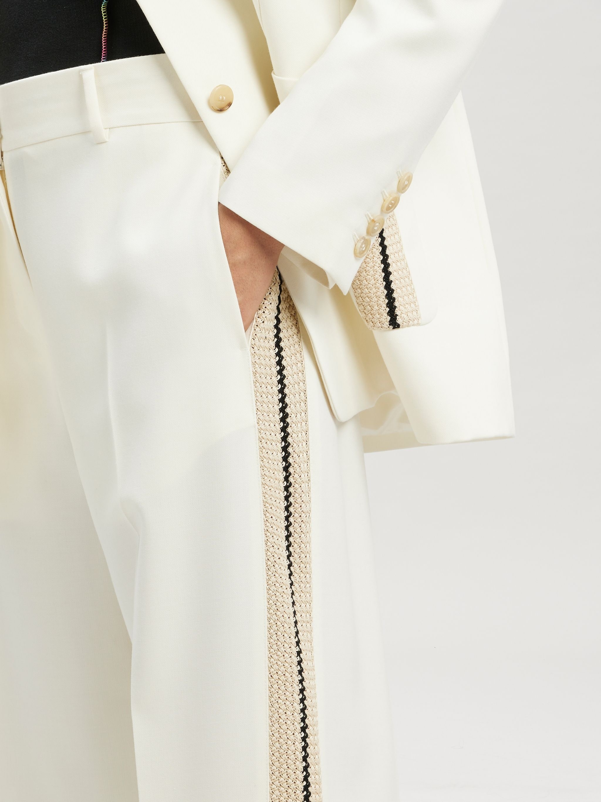LONG SUITS PANTS IN BUTTER WHITE FEATURING OFF WHITE AND BLACK KNIT TAPE STRIPES DETAIL AT SIDES. PENCES DETAIL AND TWO POCKETS AT BACK. FABRIC 55% POLYESTER 45% VIRGIN WOOL - DETAIL 100% COTTON MODEL IVANA WEARS SIZE 40 HEIGHT: 5’9" (179 CM) CHEST: 33" (85 CM) WAIST: 24" (61 CM) HIPS: 34" (87 CM) PRODUCT ID: PWCA107S23FAB0020403