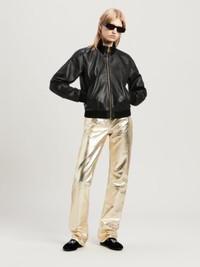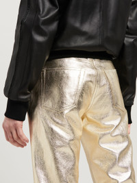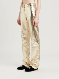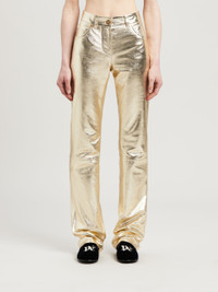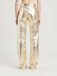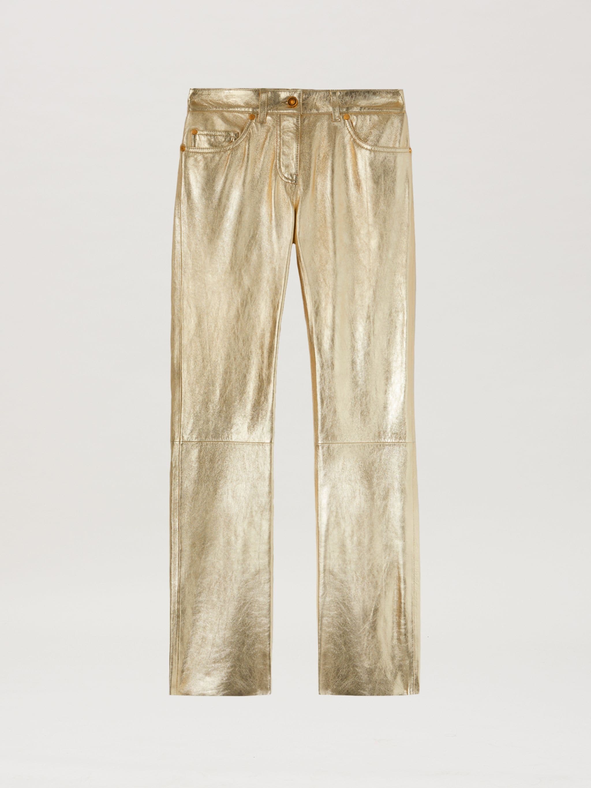 A sensational guilded piece to elevate an evening outfit and make it a holiday must-have. Laminated leather pants, slim fit, with front pleat, closed by gold button with engraved logo. FABRIC 100% LEATHER LINING 48% VISCOSE,52% ACETATE MODEL VIKTORIA WEARS SIZE 40 HEIGHT: 5’7" (171 CM) BUST: 32" (82 CM) WAIST: 23" (58 CM) HIPS: 34" (88 CM) PRODUCT ID: PWJB021F23LEA0017676