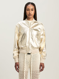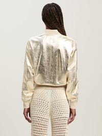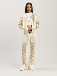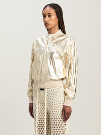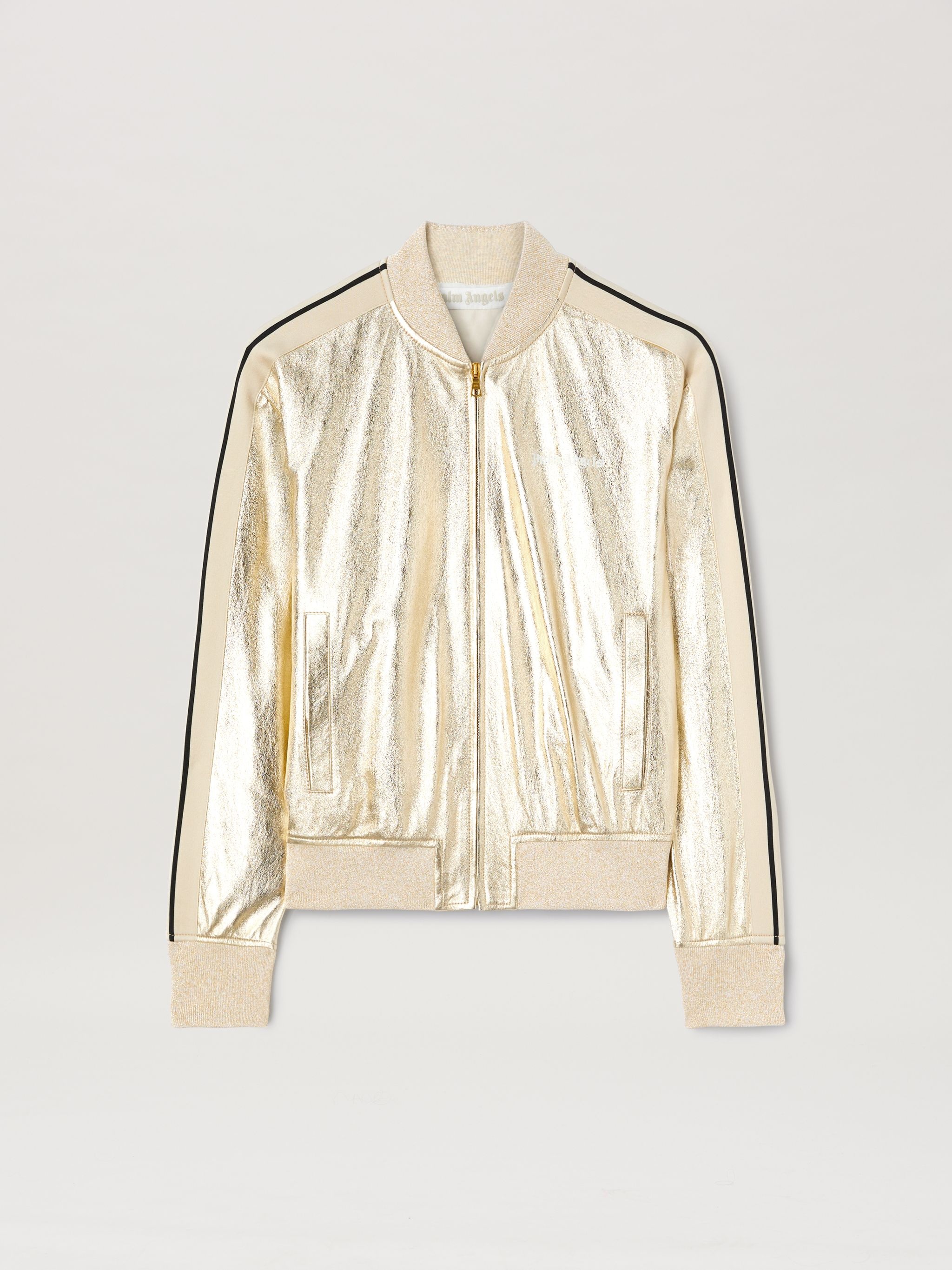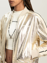 A “stellar” evolution for our iconic piece, with sidereal laminations that take it straight to party season. Women's tracksuit bomber in laminated platinum leather, with ecru side bands, zippered, and with logo Palm Angels printed in white on the front. LAURE WEARS SIZE 40 HEIGHT: 5' 9" (177 CM) BUST: 30" (78 CM) WAIST: 23" (60 CM) HIPS: 35" (87 CM) PRODUCT ID: PWJA033F24LEA0018503