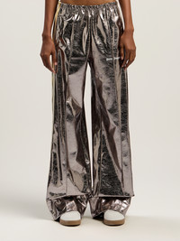 Elevate your streetwear ensemble with these laminated wide-leg track pants, offering a bold metallic finish and relaxed silhouette. - Elastic waistband for a comfortable fit - Sleek metallic finish for standout style - Wide-leg silhouette enhances movement - Subtle monogram logo on the front - Straight hem for a clean look - Side stripes for added edge - Rear construction without pockets DETAILS - 98% Polyester 2% Polyurethane, Lining: 100% Cotton, Rib detail: 96% Polyester 4% Elastan - Code: PWCJ031F25FAB0017703
