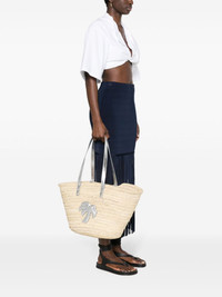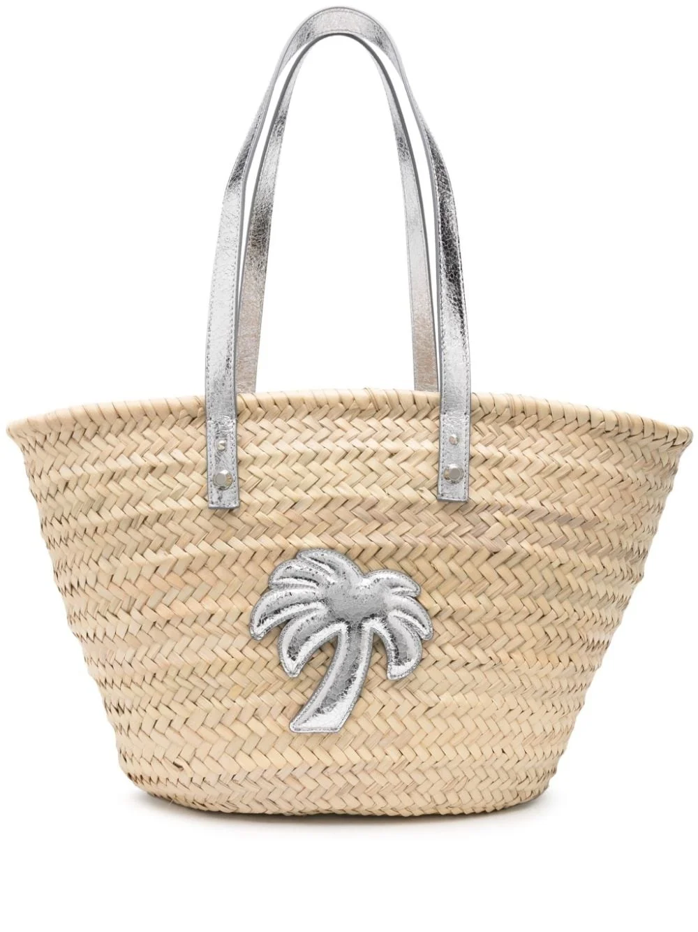 logo-applique straw beach bag Highlights - Beige/silver-tone - Straw - Interwoven design - Silver-tone stud and spike stud detailing - Metallic appliqu� logo - Open top - Two metallic leather top handles - Main compartment - This piece comes complete with a protective dust bag. Made in Italy Composition Lining: Cotton 100% Outer: Calf Leather 100%, Straw 100% SIZE & FIT Model measurements Height 5 ft 10 in(1.77 m) Bust/Chest 32.28 in(82 cm) Hips 35.03 in(89 cm) Waist 25.19 in(64 cm) Measurement DEPTH 6.29 in(16 cm) HANDLE 11.81 in(30 cm) HEIGHT 11.81 in(30 cm) WIDTH 21.65 in(55 cm)