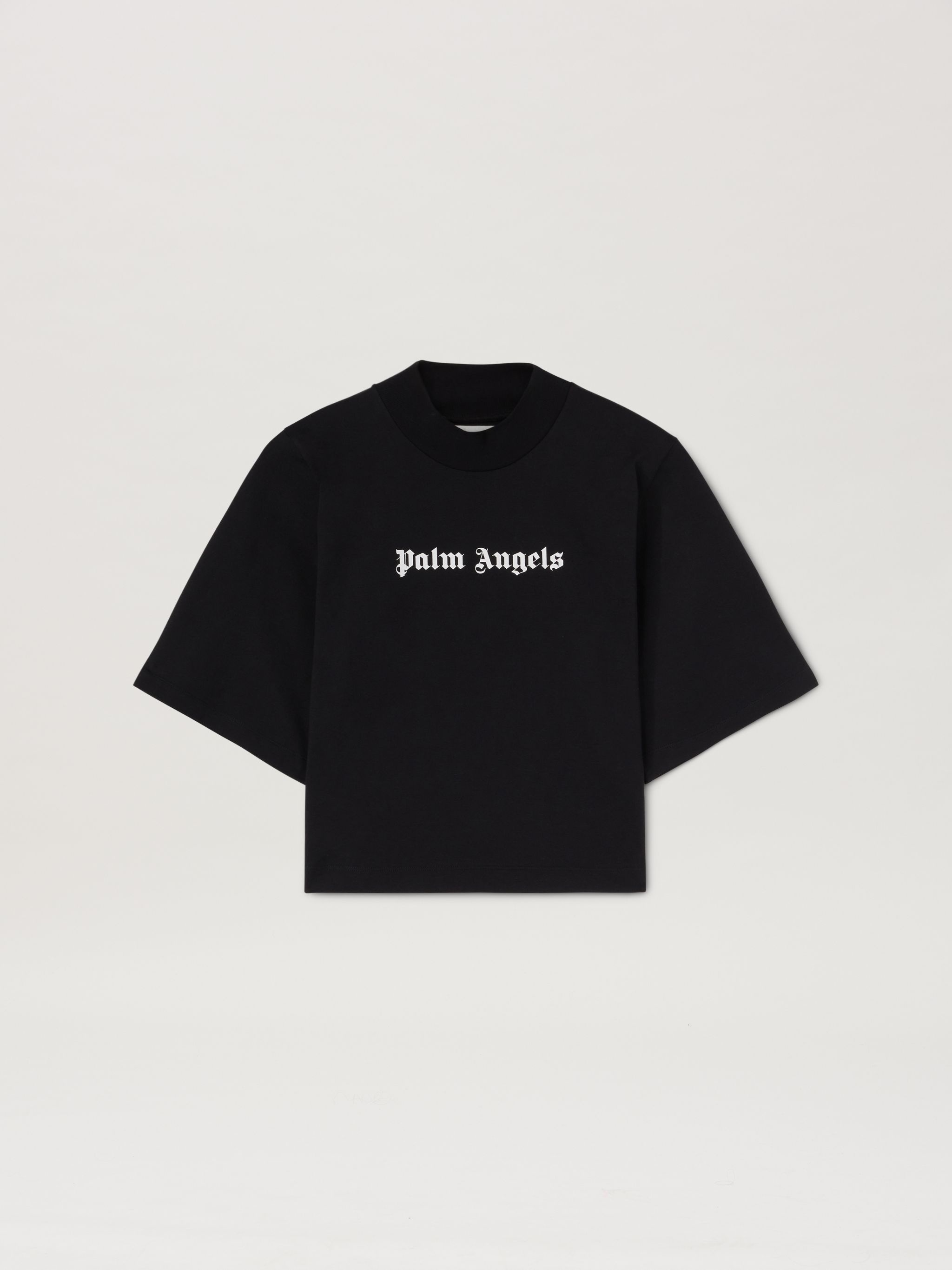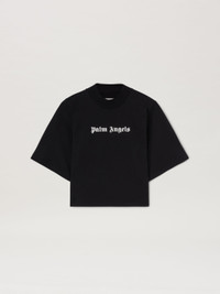 Challenging icons, playing with dimensions, introducing a soft font with rounded corners, rotating axes and placing the logo vertically, reconditioning its meaning and function. Joyful and witty variants of the logo arise under the Palm-typefaces theme of Summer 2024. Women's black cropped T-shirt with dropped sleeves and Palm Angels logo printed in white on the front. PRODUCT ID: PWAA020S24JER0031001