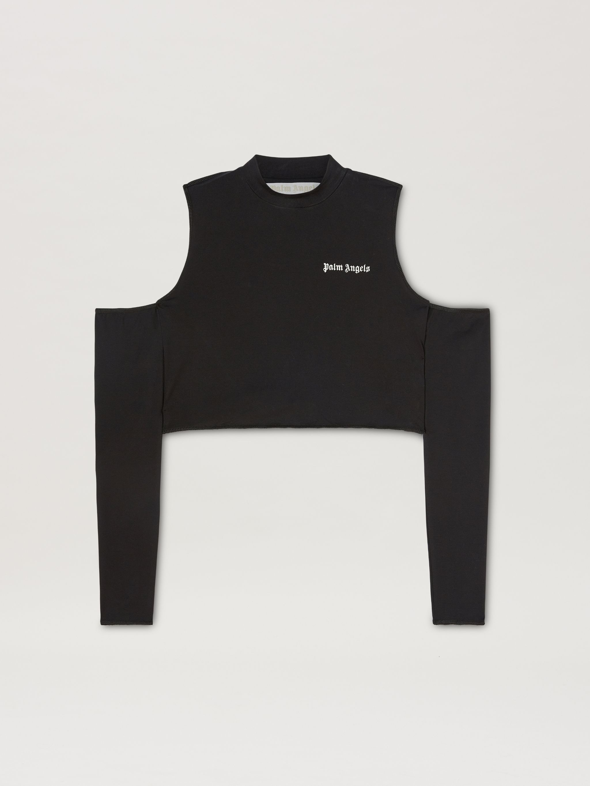 Women's black long-sleeved, mock neck top, cropped, and with shoulders cutouts. Palm Angels logo printed in white on the front. FABRIC 90% COTTON 10% ELASTAN EMBROIDERY 100% POLYESTER MODEL HANNA WEARS SIZE S HEIGHT: 5'8" (177 CM) BUST: 31" (80 CM) WAIST: 24" (62 CM) HIPS: 35" (88 CM) PRODUCT ID: PWAB029F23FAB0011003