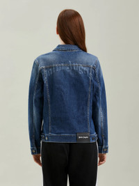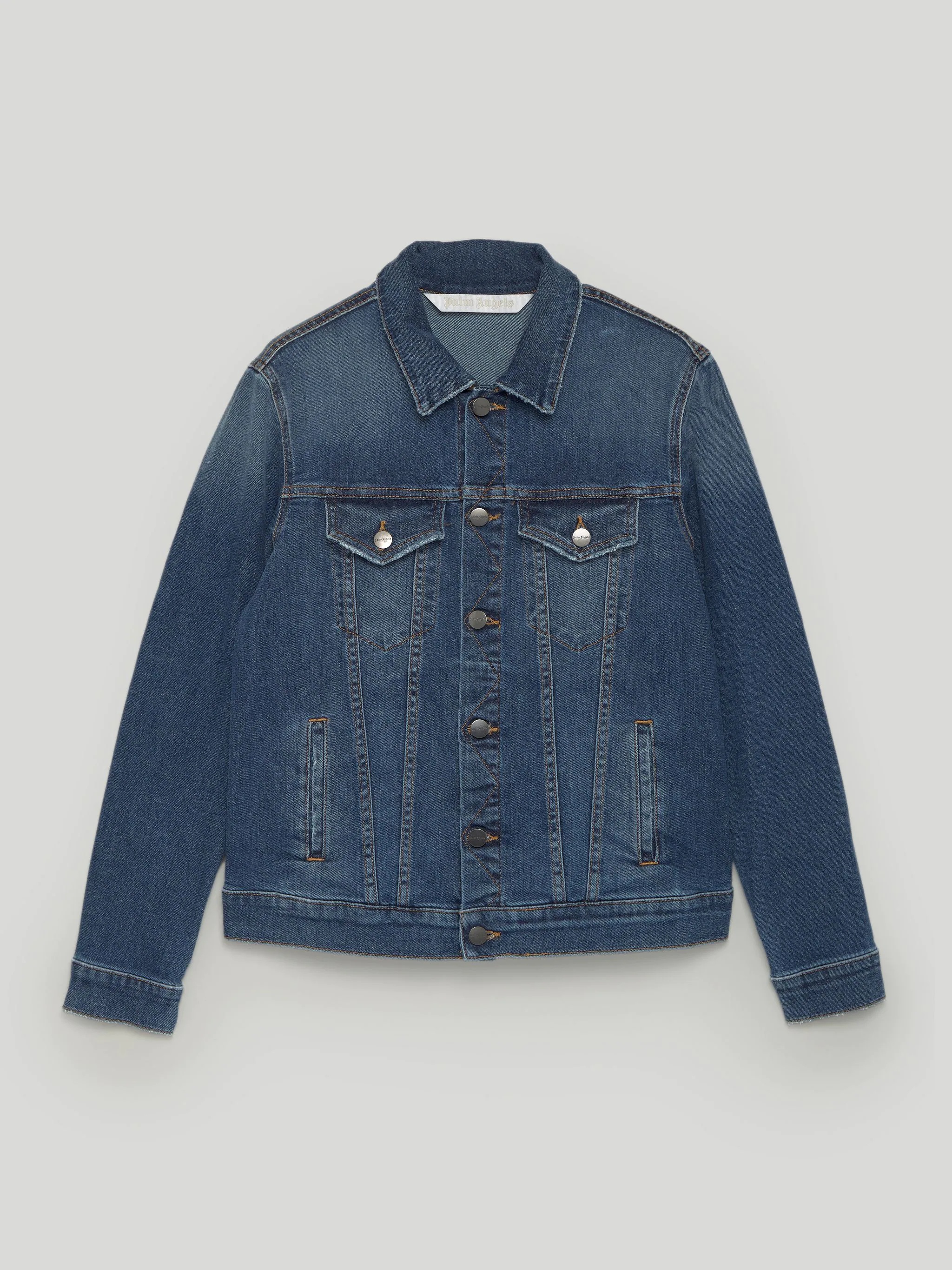 LONG SLEEVES DENIM JACKET IN BLUE WASH. "PALM ANGELS" LOGO PRINTED AT BACK. BUTTON CLOSURE. SPREAD COLLAR. FLAP POCKETS. BUTTON BARREL CUFFS. FABRIC 98% COTTON 2% ELASTANE MODEL IRENE WEARS SIZE S HEIGHT: 5.9" (175 CM) BUST: 31" (78 CM) WAIST: 23" (59 CM) HIPS: 35" (88 CM) PRODUCT ID: PWYE011F21DEN0014001