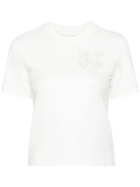 logo-embroidered cotton T-shirt Highlights - White - Cotton - Embroidered logo at the chest - Crew neck - Short sleeves - Straight hem Made in Italy Composition Polyester 100%, Cotton 100% SIZE & FIT Model measurements Height 5 ft 11 in(1.8 m) Bust/Chest 33.07 in(84 cm) Hips 37.4 in(95 cm) Waist 25.19 in(64 cm) FittingInformation Designed for a slim fit that sits just away from the body offering a close yet comfortable fit Made from a midweight non-stretch fabric, this piece offers minimal elasticity when worn This piece fits true to size – take your usual size Washing instructions Machine Wash