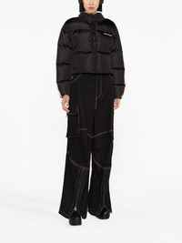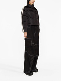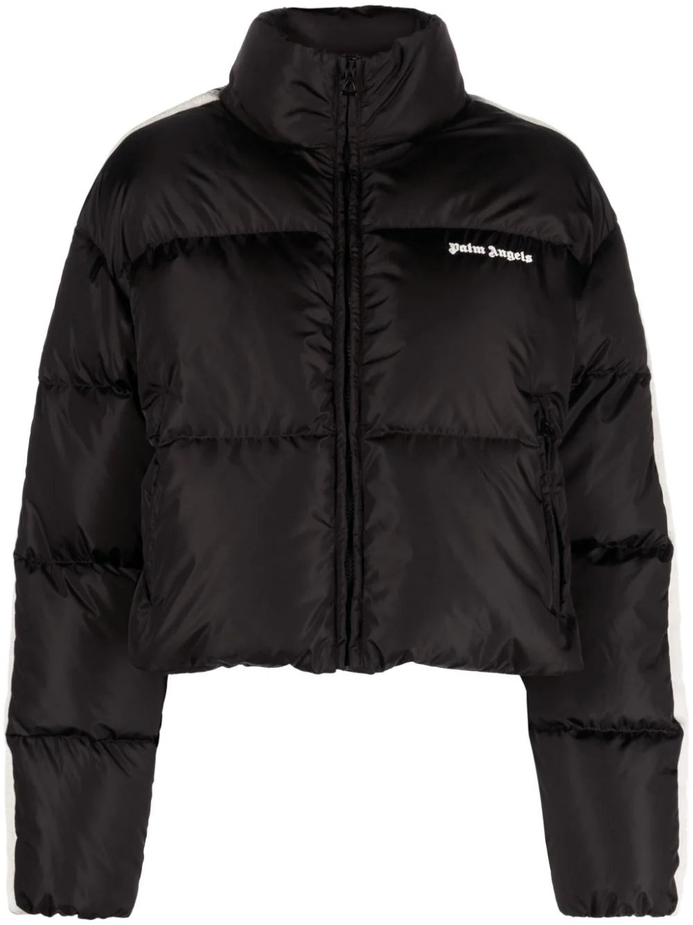 PALM ANGELS WOMEN logo-embroidered puffer jacket This Palm Angels puffer jacket is imbued with street-style energy. Filled with insulative feather down, it's decorated with stripes that run down the sleeves, whilst the familiar tattoo-inspired logo lettering is embroidered on the chest in contrasting white threads. Highlights black/white feather down padded design embroidered logo at the chest side stripe detailing funnel neck front zip fastening long sleeves two side zip-fastening pockets Composition Outer: Polyamide 100%, Polyester 100% Lining: Polyamide 100%, Polyester 100%, Down 80%, Feather 20% Washing instructions Machine Wash Wearing The model is 1.78 m. Fitting information Designed to be unstructured, offering a loose fit throughout The internal drawstring at the hem allows for fitted preferences Made from a padded non-stretch fabric, giving it no natural elasticity This piece fits true to size – take your usual size