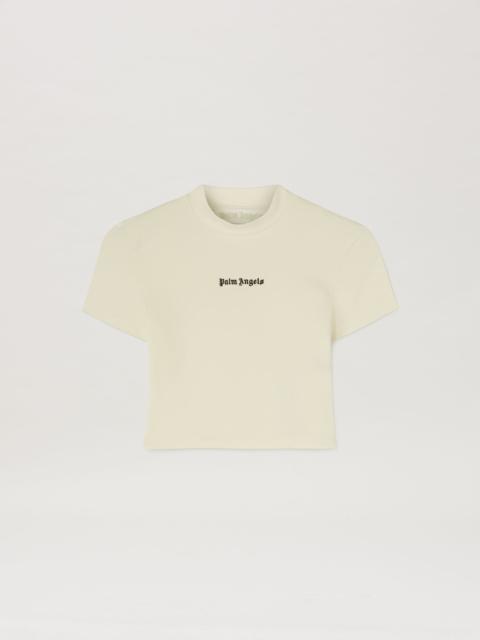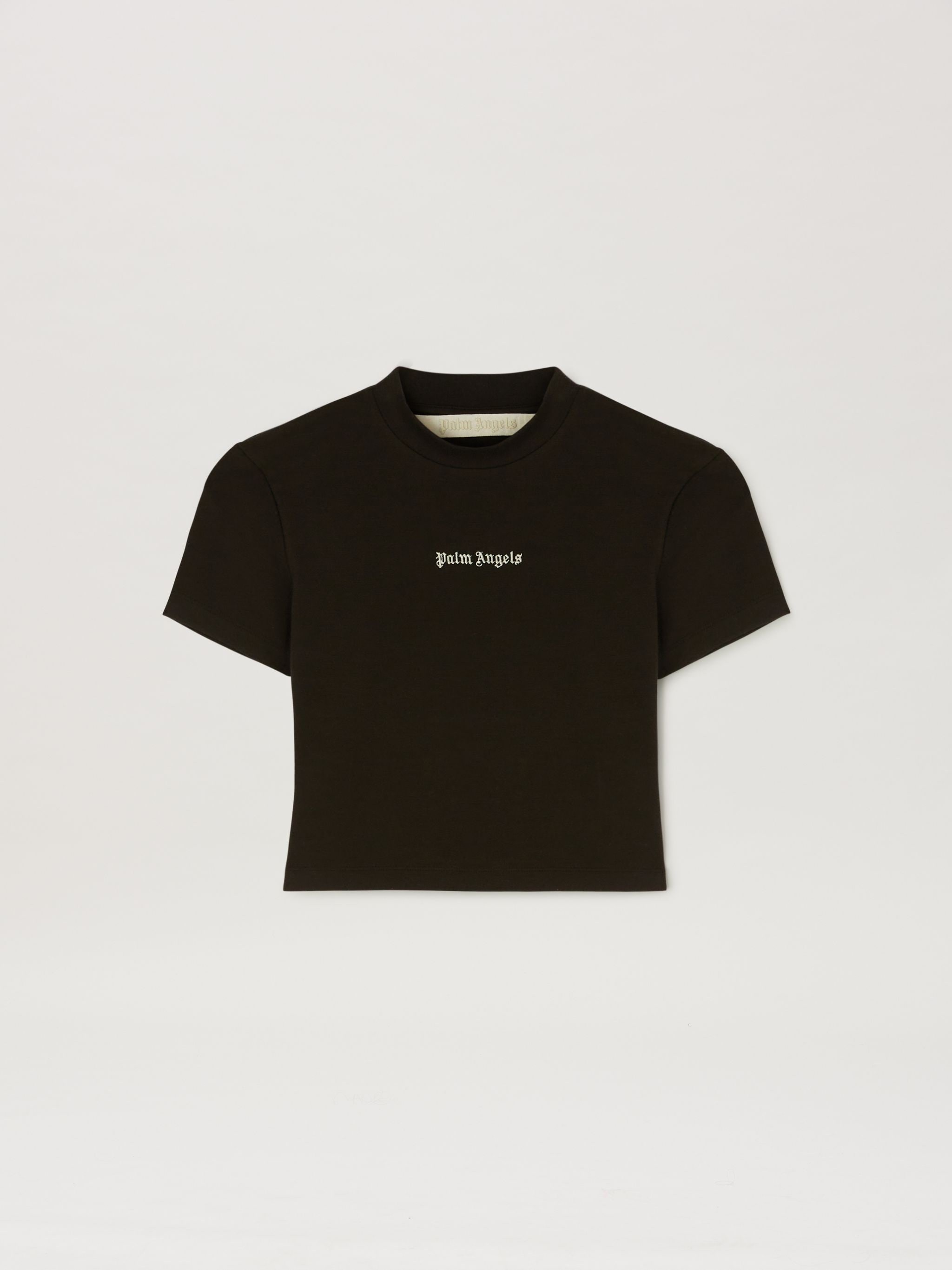 Extremely simple, incredibly expressive. Women's black cropped slim fit T-shirt with logo Palm Angels embroidered in white on front. EMBROIDERY 100% POLYESTER - FABRIC 47% COTTON 47% POLYESTER 6% ELASTAN PRODUCT ID: PWAA074F24JER0021003