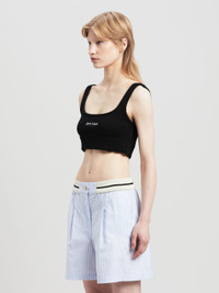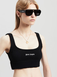 Women's black knit top with ribbed hem and Palm Angels logo in white embroidered on front. Viktoria wears size S Height: 5' 7½" (171 cm) Bust: 32½" (82 cm) Waist: 23" (58 cm) Hips: 34½" (88 cm) PRODUCT ID: PWHT016S24KNI0011003