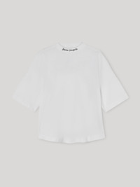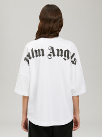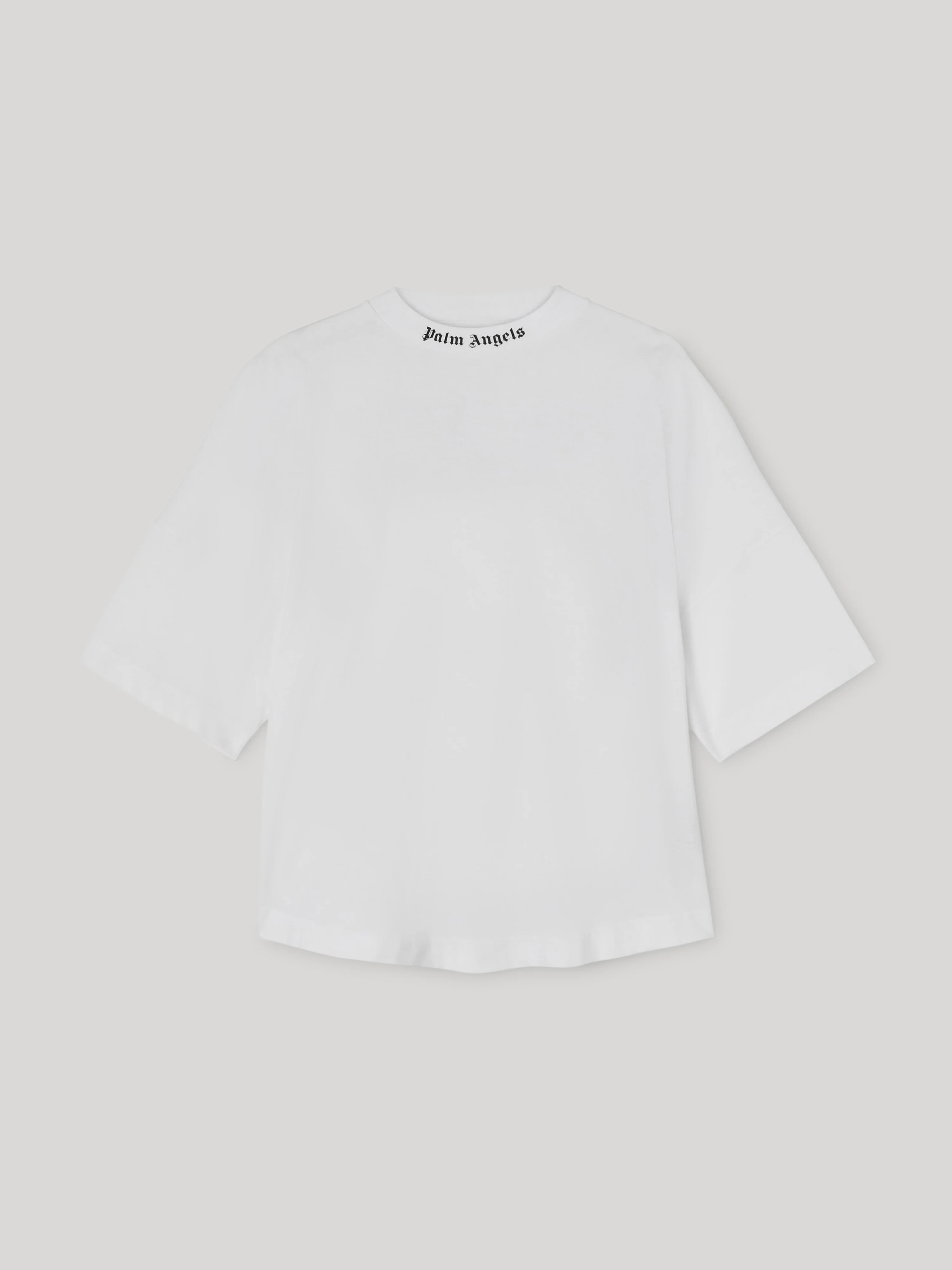 The oversized silhouette of this Palm Angels white T-shirt is a sign of the brand's LA skate culture inspirations. Crafted from lightweight cotton with a high neck, it is adorned with the gothic font logo that draws flashes from rebellious and tattoo-art aesthetics. DETAILS - FABRIC 100% COTTON - RIB DETAIL 100% COTTON - Code: PWAA023C99JER0020110