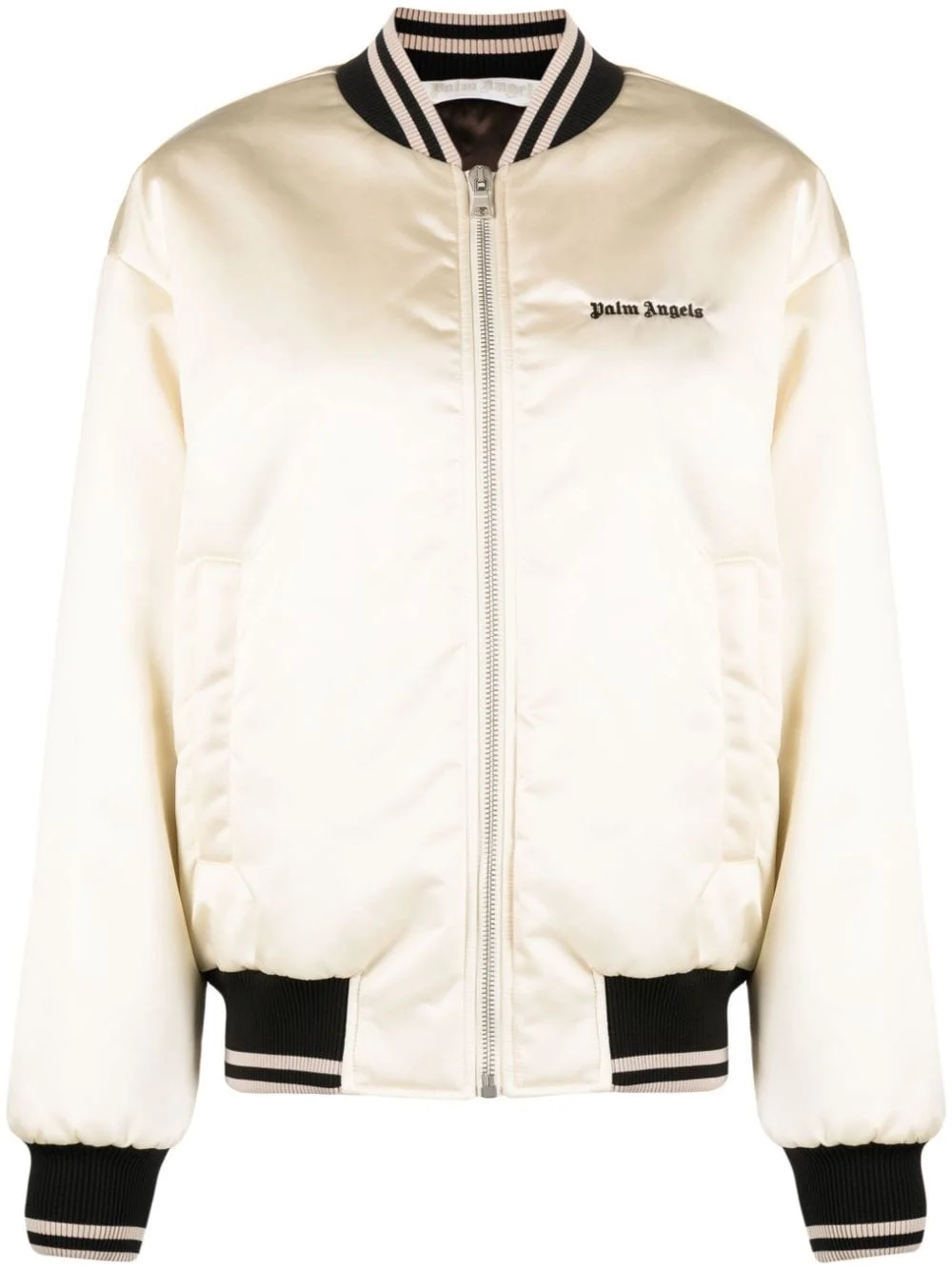 logo-print bomber jacket Palm Angels updates the classic bomber jacket with a shiny satin construction here. This model is presented in a sleek light beige and black colourway enhanced with ribbed striped detailing at the collar, cuffs and hem. Highlights - Black/light beige - Logo print at the chest - Stand-up collar - Front zip fastening - Long sleeves - Ribbed cuffs and hem Made in Italy Composition Outer: Polyamide 100%, Polyester 100% Lining: Viscose 100%, Polyester 100% SIZE & FIT Model measurements Height 5 ft 10 in(1.78 m) Bust/Chest 29.92 in(76 cm) Hips 34.64 in(88 cm) Waist 23.62 in(60 cm) Measurement SLEEVE LENGTH 24.4 in(62 cm) LENGTH 25.98 in(66 cm) FittingInformation Designed to be unstructured, offering a loose fit throughout The ribbed hem offers a close, comfortable fit Made from a padded non-stretch fabric, giving it no natural elasticity This piece fits true to size – take your usual size
