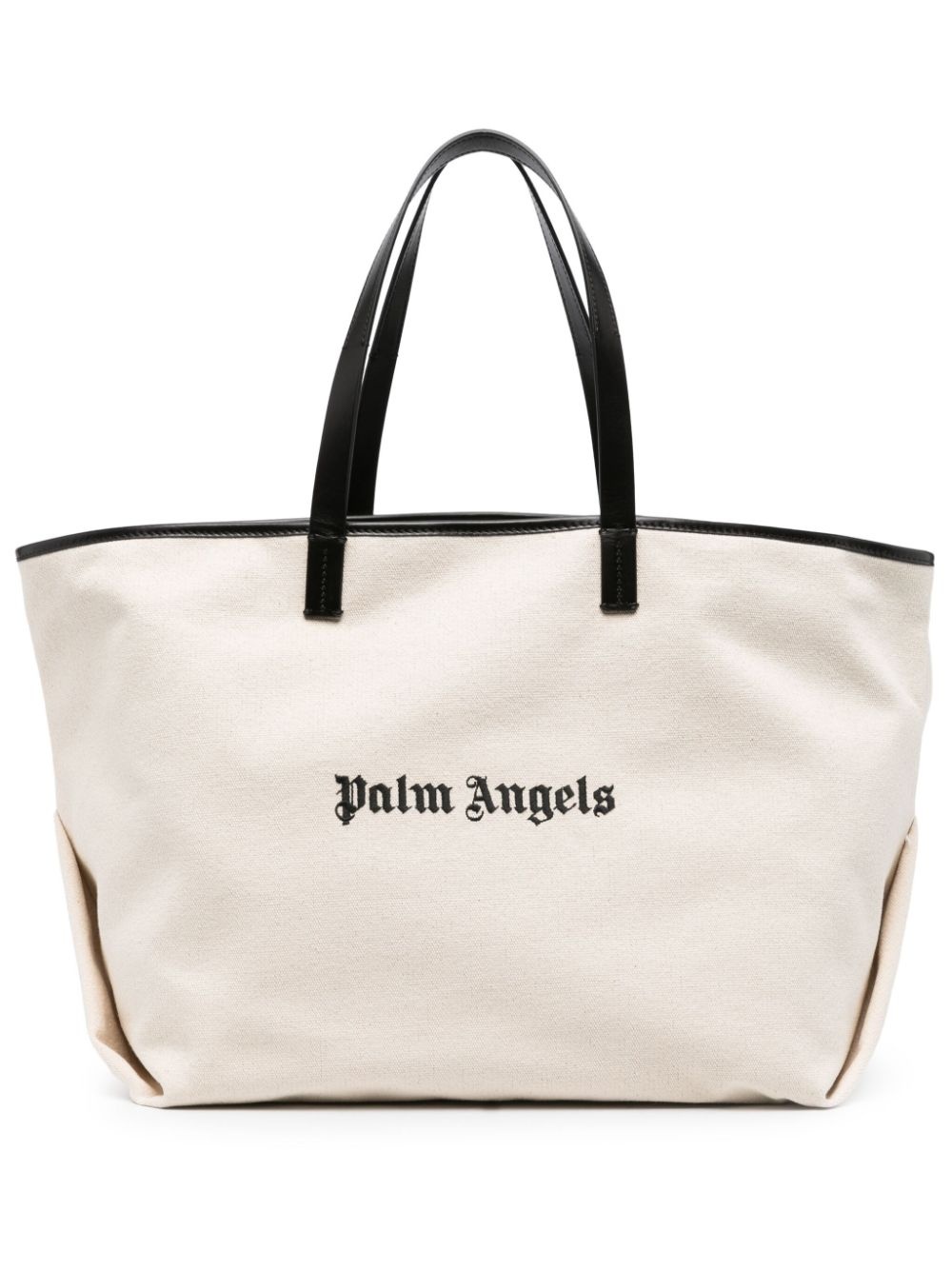 PALM ANGELS WOMEN logo-print canvas tote bag Palm Angels offers a blend of practicality and contemporary style with this tote bag. Detailed with a large graphic to the front, it is finished with a spacious compartment and leather top handles. Highlights white/black cotton canvas leather trim leather top handles main compartment internal logo patch Composition Outer: Cotton 100%, Calf Leather 100% Lining: Cotton 100% Wearing The model is 1.77 m wearing size OS