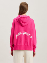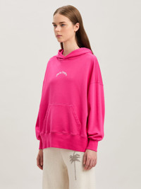Logo mutations that turn a timeless icon into a new seasonal graphic. Women's fuchsia zipped hoodie with Curved logo in soft pink printed on the back. TILDA WEARS SIZE S HEIGHT: 5’ 10” (178 CM) BUST: 28” (73 CM) WAIST: 23” (60 CM) HIPS: 35" (89 CM) PRODUCT ID: PWBB074S25FLE001323C