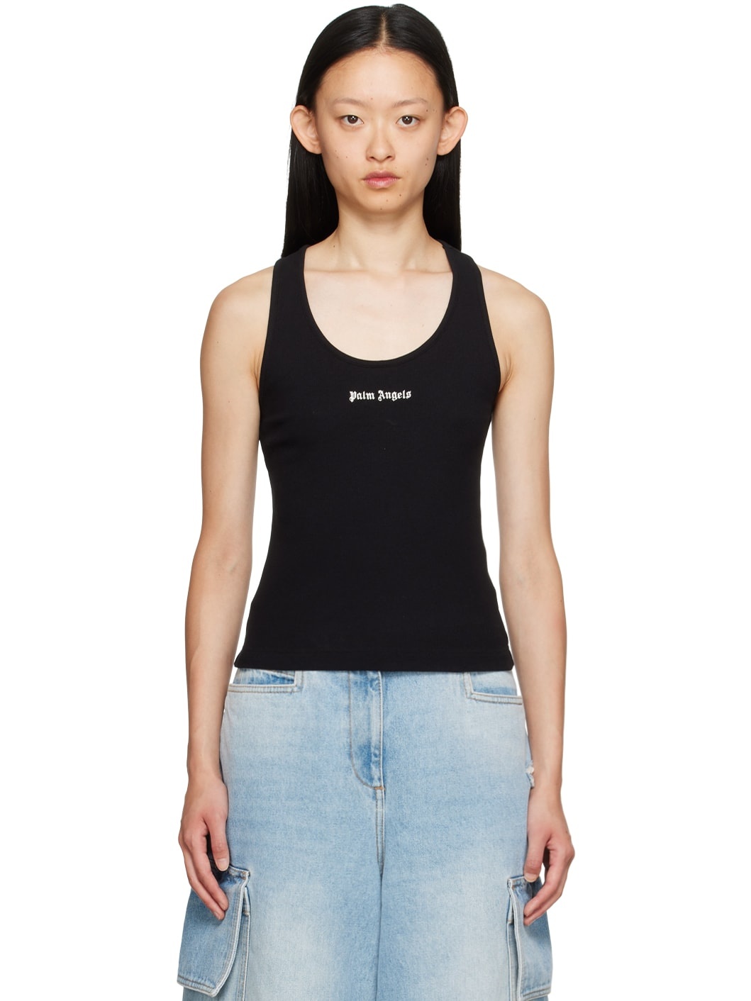 Rib knit stretch cotton tank top. · Scoop neck · Logo embroidered at chest · Racer back Supplier color: Black/Off white