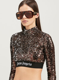 Women's cropped, long-sleeved top, all covered in brown animalier-effect sequins and piped with black elastic ribbon with Palm Angels logo in white. FABRIC 100% POLYESTER LINING 82% POLYAMIDE 18% ELASTAN DETAIL 67% POLYAMIDE 23% POLYESTER 10% ELASTAN MODEL HANNA WEARS SIZE S HEIGHT: 5'8" (177 CM) BUST: 31" (80 CM) WAIST: 24" (62 CM) HIPS: 35" (88 CM) PRODUCT ID: PWAB038F23FAB0016010