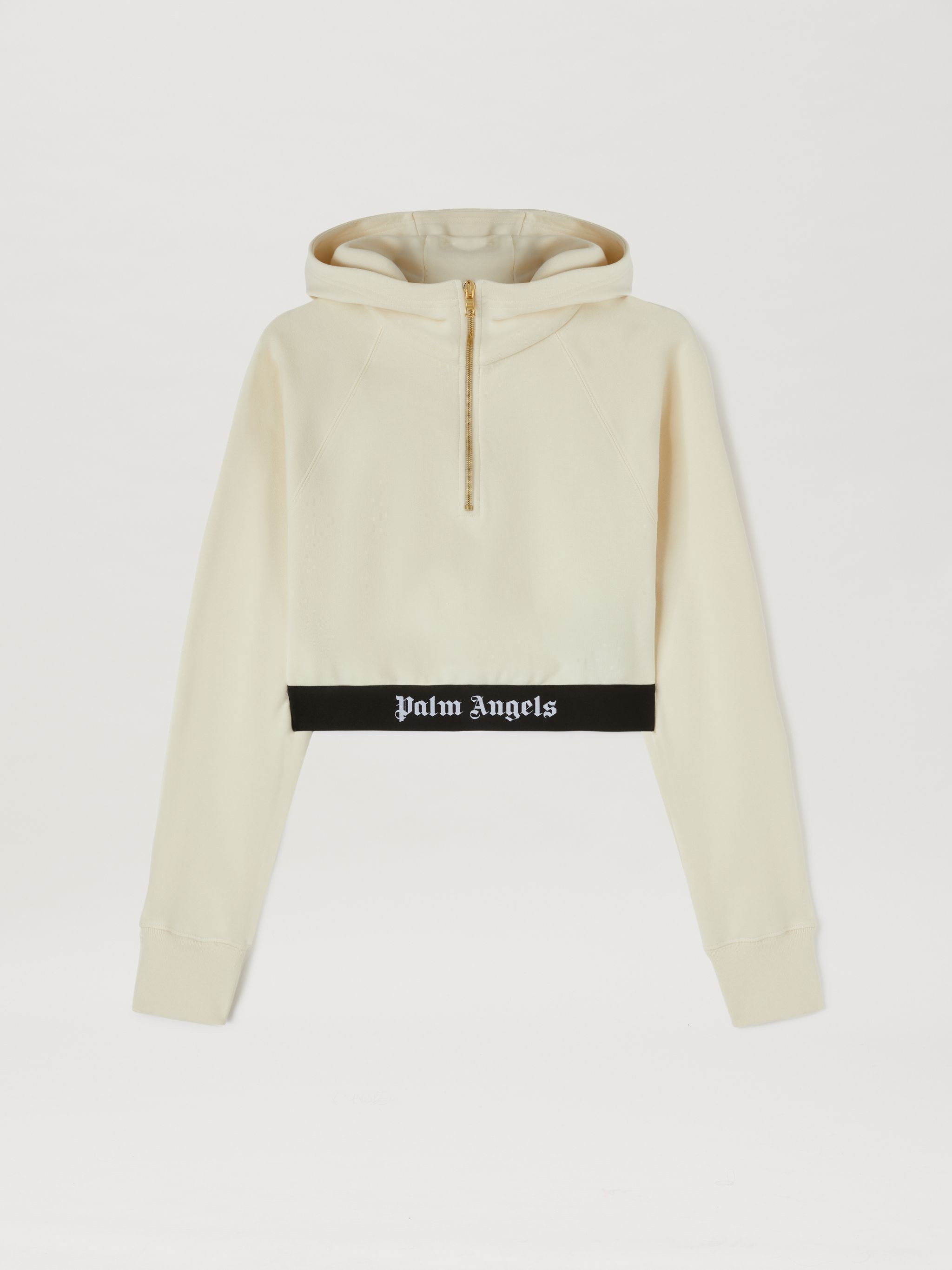 Women's white hoodie, with half-zip and black elastic hem with white Palm Angels logo printed front and back. PRODUCT ID: PWBB062S24FLE0010310