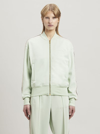 Women's white, zippered tracksuit jacket with ecru side bands, vertical pockets and Palm Angels logo embroidered in white on front. Viktoria wears size S Height: 5' 7½" (171 cm) Bust: 32½" (82 cm) Waist: 23" (58 cm) Hips: 34½" (88 cm) PRODUCT ID: PWBD050S24FAB0015103