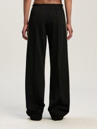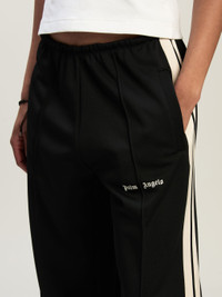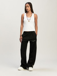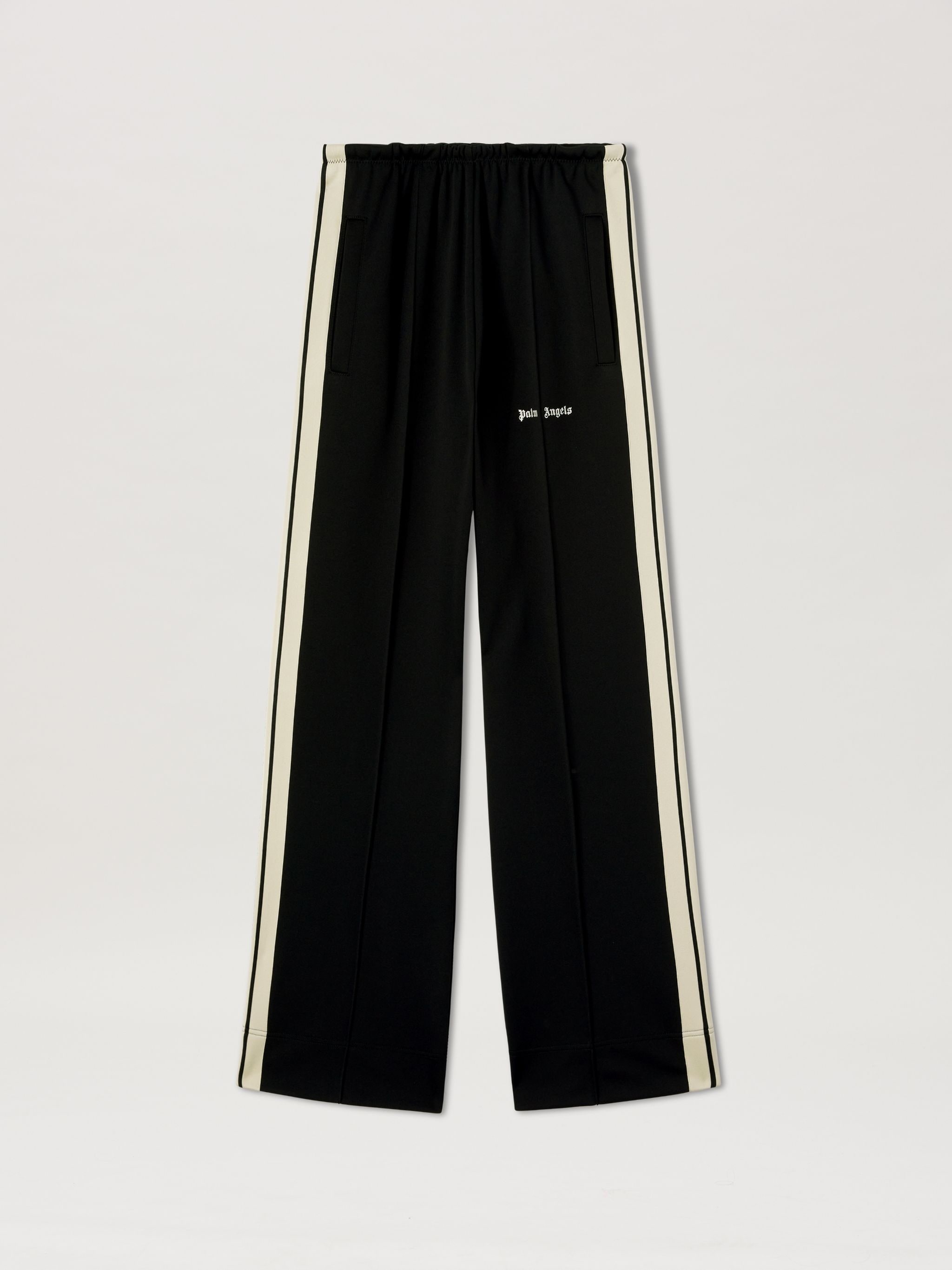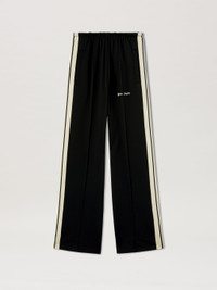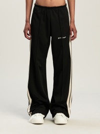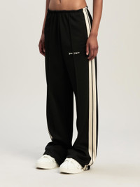 The new tracksuits have fluid, loose-fitting lines for a tailored-athletic feel. Women's black tracksuit pants with loose fit, ecru side bands and Palm Angels logo embroidered in white on front. LAURE WEARS SIZE S HEIGHT: 5' 9" (177 CM) BUST: 30" (78 CM) WAIST: 23" (60 CM) HIPS: 35" (87 CM) PRODUCT ID: PWCJ031C99FAB0011003
