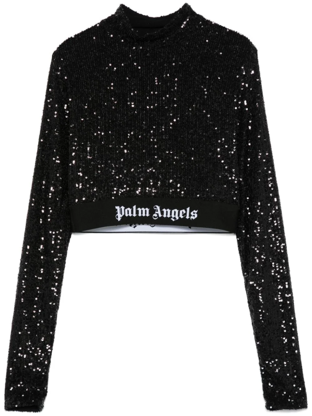 logo-waistband sequined top Highlights - Black - Stretch-design - Sequin design - Mock neck - Long sleeves - Elasticated logo waistband - Straight hem - Cropped Made in Italy Composition Polyamide 92%, Elastane 8% SIZE & FIT Model measurements Height 5 ft 10 in(1.78 m) Bust/Chest 33.85 in(86 cm) Hips 36.61 in(93 cm) Waist 26.77 in(68 cm) FittingInformation Designed for a close fit throughout Cropped in length Made from a midweight stretch fabric, this piece offers elasticity and flexibility when worn