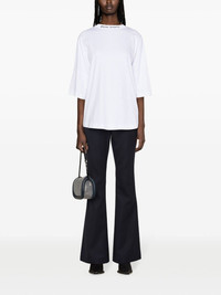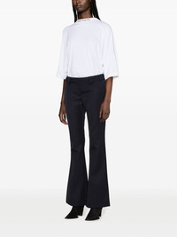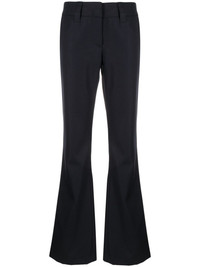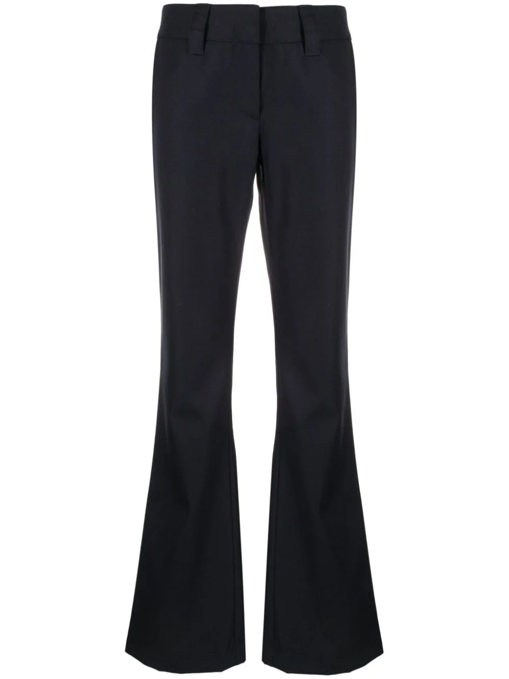 low-rise flared trousers Highlights - Navy blue - Logo patch to the rear - Low-rise - Belt loops - Concealed front fastening - Flared Made in Italy Composition Outer: Polyester 55%, Virgin Wool 45% Lining: Viscose 100% SIZE & FIT Model measurements Height 5 ft 11 in(1.8 m) Bust/Chest 34.25 in(87 cm) Hips 35.82 in(91 cm) Waist 24.8 in(63 cm) FittingInformation Designed with a flared hem, these trousers allow for a close fit at the waist with a slim fit over the leg and widening towards the hem Made from a midweight non-stretch fabric This piece fits true to size – take your usual size