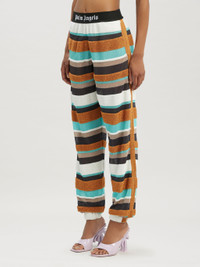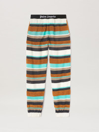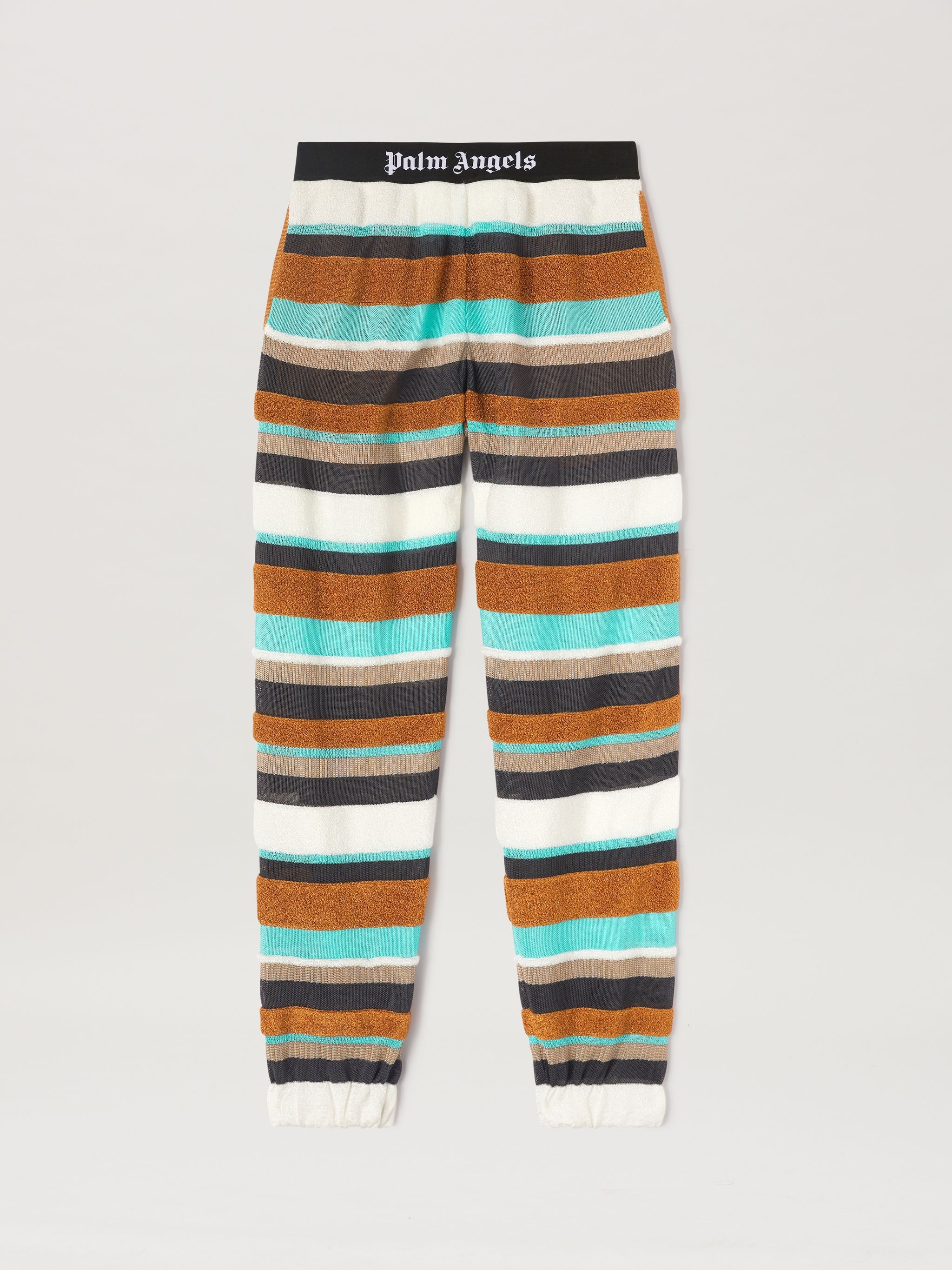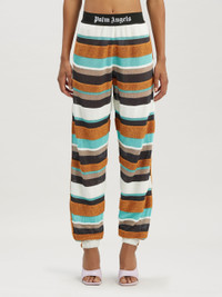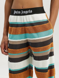 LONG PANTS WITH HORIZONTAL MULTICOLOUR STRIPES DETAIL. ELASTICIZED BLACK WAISTBAND FEATURING WHITE "PALM ANGELS" LOGO EMBROIDERED AT FRONT. TWO-POCKET STYLING. ANKLE CUFFS. FABRIC 57% ACETATE 28% VISCOSE 8% METALLIZED FIBER 7% POLYAMIDE MODEL LAURE WEARS SIZE S HEIGHT: 5’8" (176 CM) CHEST: 31” (78 CM) WAIST: 23” (58 CM) HIPS: 33” (84 CM) PRODUCT ID: PWHG019S23KNI0018410