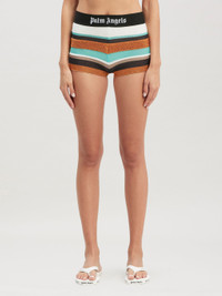 MINI SHORTS WITH HORIZONTAL MULTICOLOR STRIPES. ELASTICIZED BLACK WAISTBAND FEATURING "PALM ANGELS" LOGO PRINTED IN WHITE AT FRONT. FABRIC 48% ACETATE 39% VISCOSE 7% METALLIZED FIBER 6% POLYAMIDE MODEL IVANA WEARS SIZE S HEIGHT: 5’9" (179 CM) CHEST: 33” (85 CM) WAIST: 24” (61 CM) HIPS: 34” (87 CM) PRODUCT ID: PWHM005S23KNI0018410