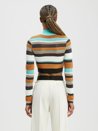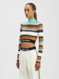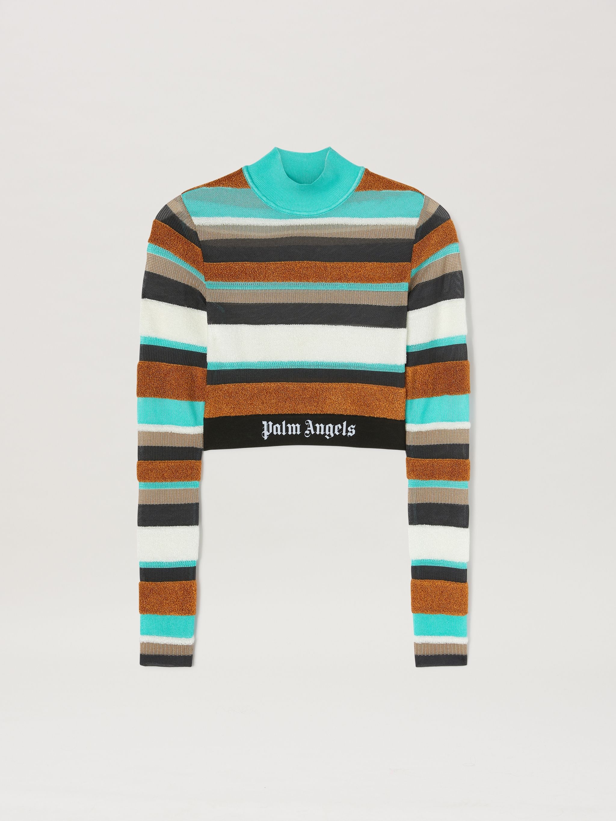 CROPPED LONG SLEEVES MOCK NECK TOP WITH HORIZONTAL MULTICOLOR STRIPES ALL OVER. ELASTICIZED BLACK WAISTBAND WITH "PALM ANGELS" LOGO PRINTED IN WHITE. FABRIC 48% ACETATE 39% VISCOSE 7% METALLIZED FIBER 6% POLYAMIDE MODEL LAURE WEARS SIZE S HEIGHT: 5’8" (176 CM) CHEST: 31” (78 CM) WAIST: 23” (58 CM) HIPS: 33” (84 CM) PRODUCT ID: PWHF022S23KNI0018410