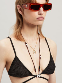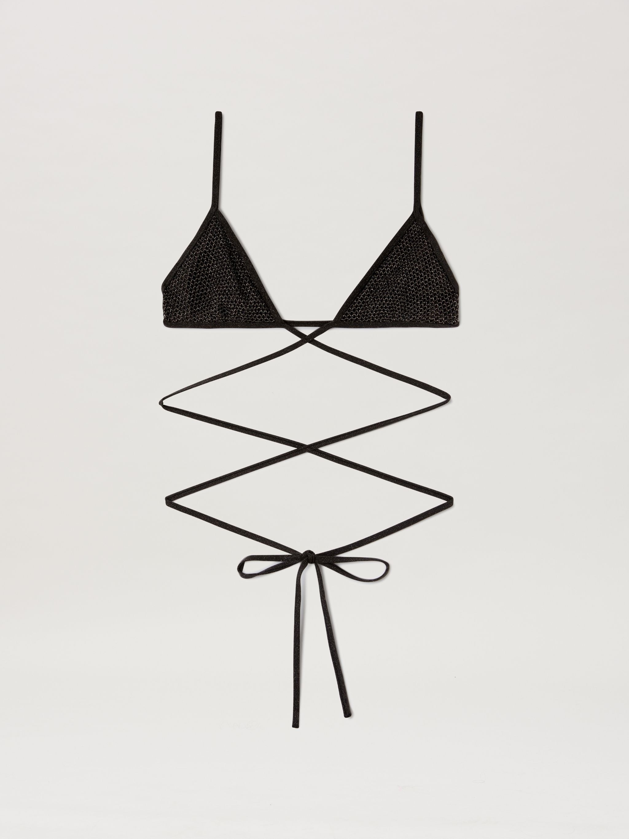 Women's black lurex triangle top with long criss cross ties to cinch in front Viktoria wears size S Height: 5' 7½" (171 cm) Bust: 32½" (82 cm) Waist: 23" (58 cm) Hips: 34½" (88 cm) PRODUCT ID: PWFH011S24FAB0011076