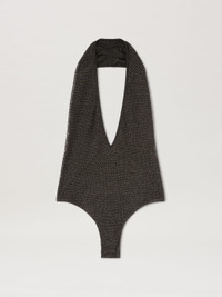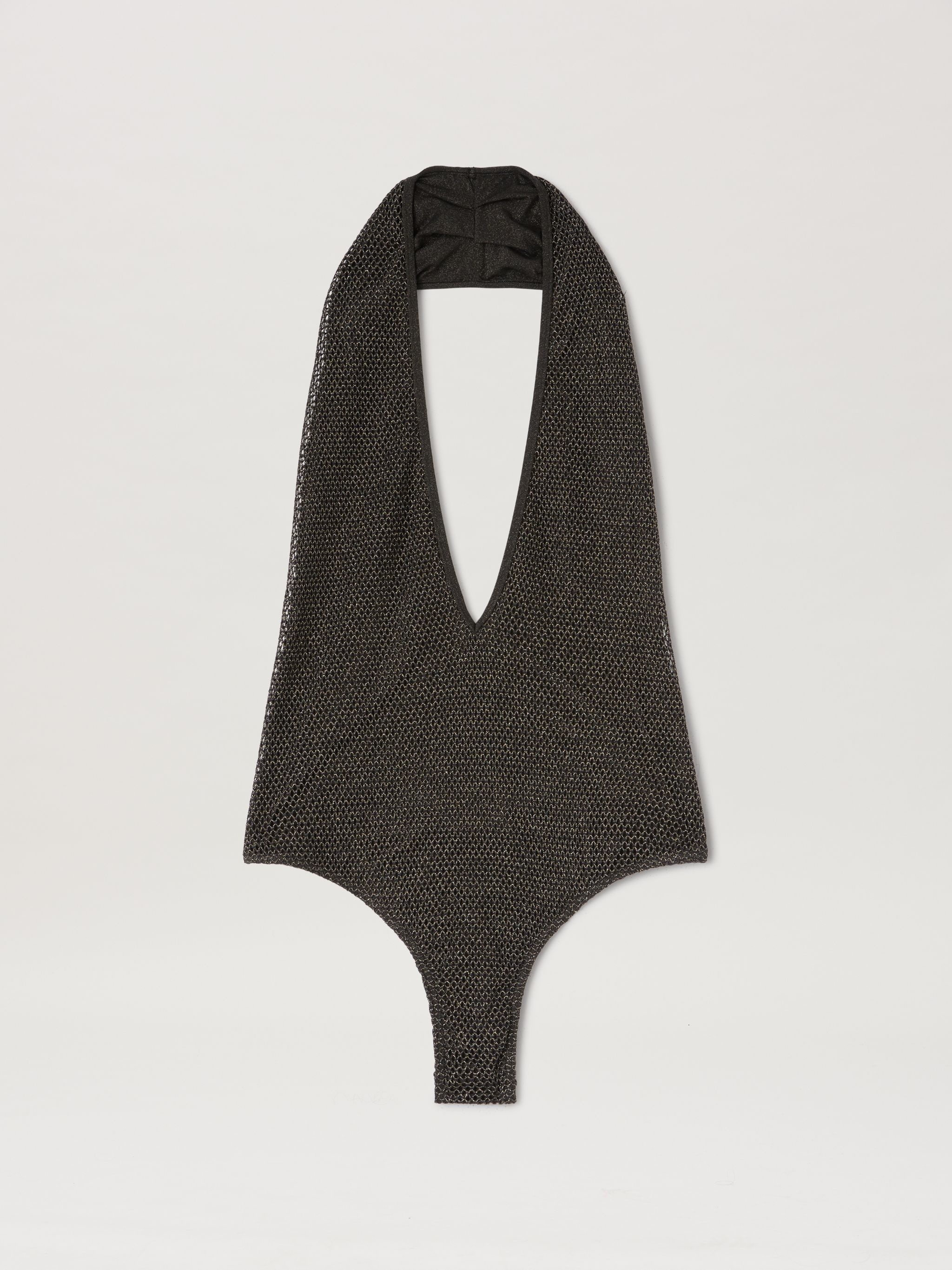 Women's black lurex one-piece swimsuit with deep V neckline in front and bare back. still life PRODUCT ID: PWFC008S24FAB0011076