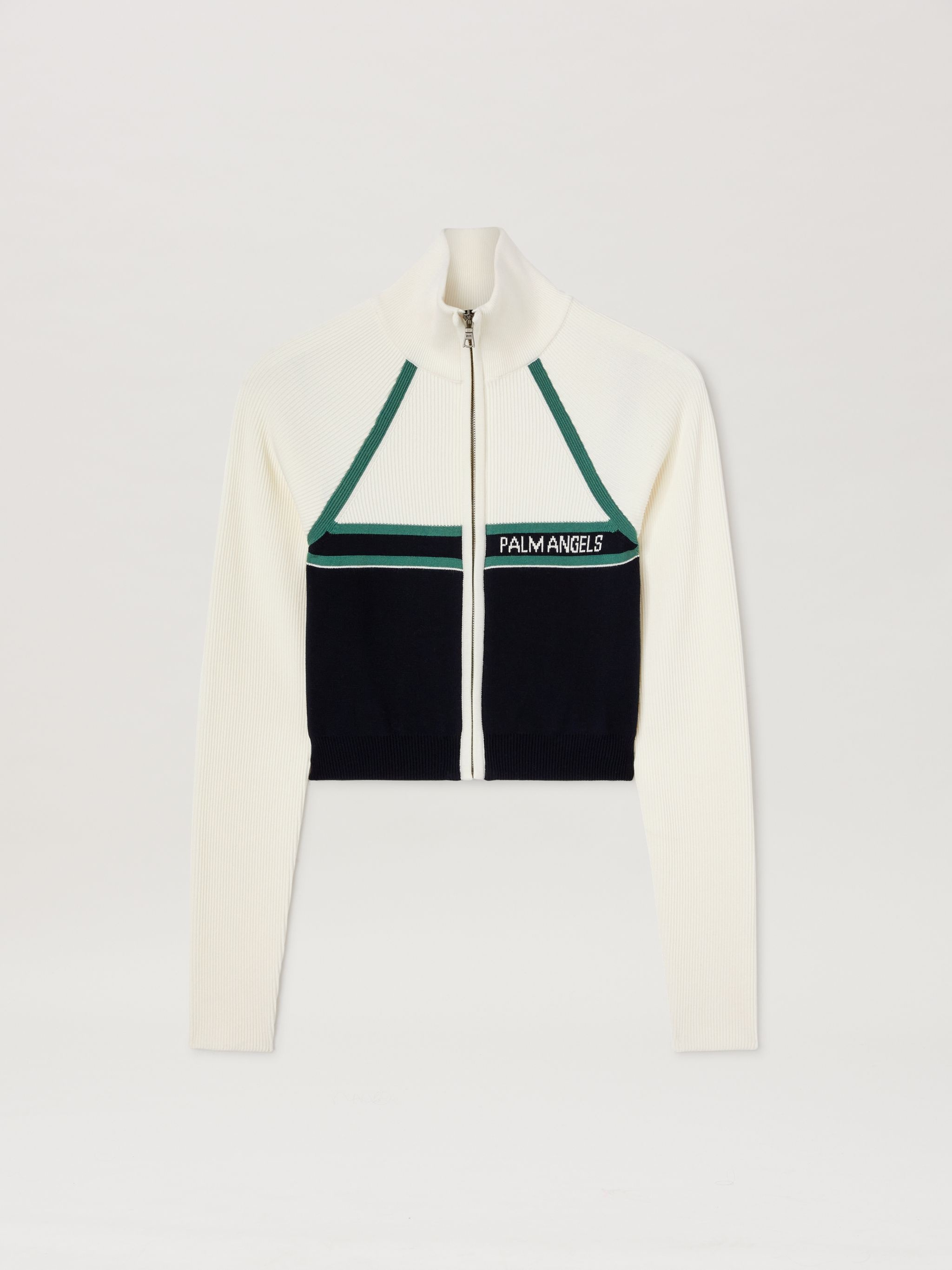 Inlays and mix of stitches, bold colors and dynamic shapes synonymous with the speed and adrenaline of the Racing world. Women's white knit cropped jacket with green and navy blue details, silver zipper, and jacquard logo on the front. RENDA WEARS SIZE S HEIGHT: 5’ 10” (179 CM) BUST: 30” (77 CM) WAIST: 23” (60 CM) HIPS: 33” (85 CM) PRODUCT ID: PWHF033S25KNI0014603