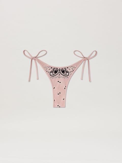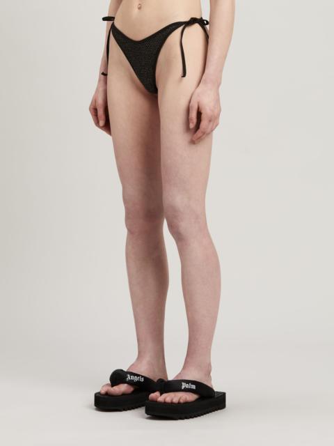 Women's V-leg bikini bottom in metallic blue fabric, with hip ties and gold Monogram applied on the side. Viktoria wears size S Height: 5' 7½" (171 cm) Bust: 32½" (82 cm) Waist: 23" (58 cm) Hips: 34½" (88 cm) PRODUCT ID: PWFG007S24FAB0014949