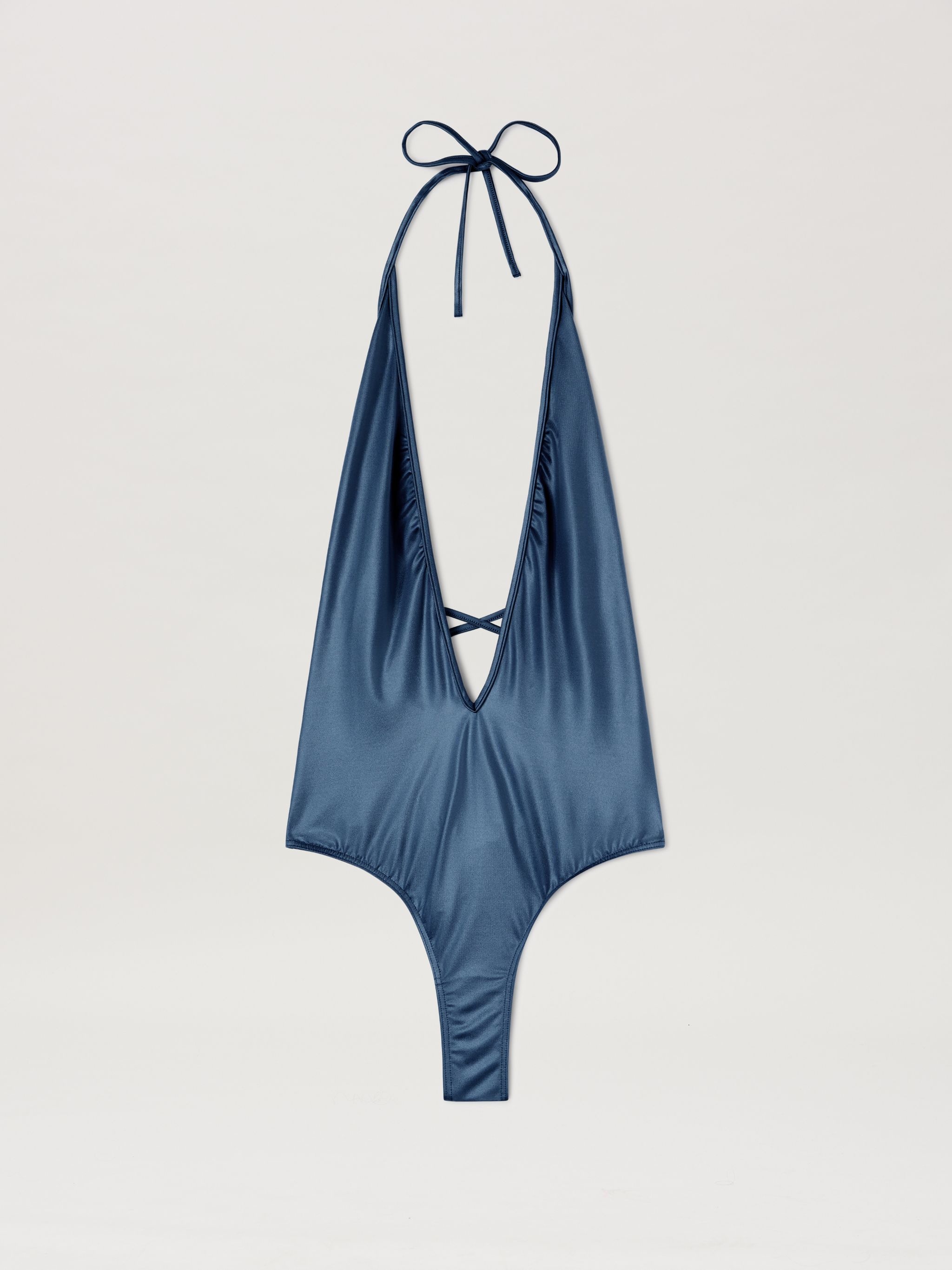 Women's one-piece swimsuit in metallic blue fabric with deep V neckline in front and bare back. Viktoria wears size S Height: 5' 7½" (171 cm) Bust: 32½" (82 cm) Waist: 23" (58 cm) Hips: 34½" (88 cm) PRODUCT ID: PWFC007S24FAB0014949