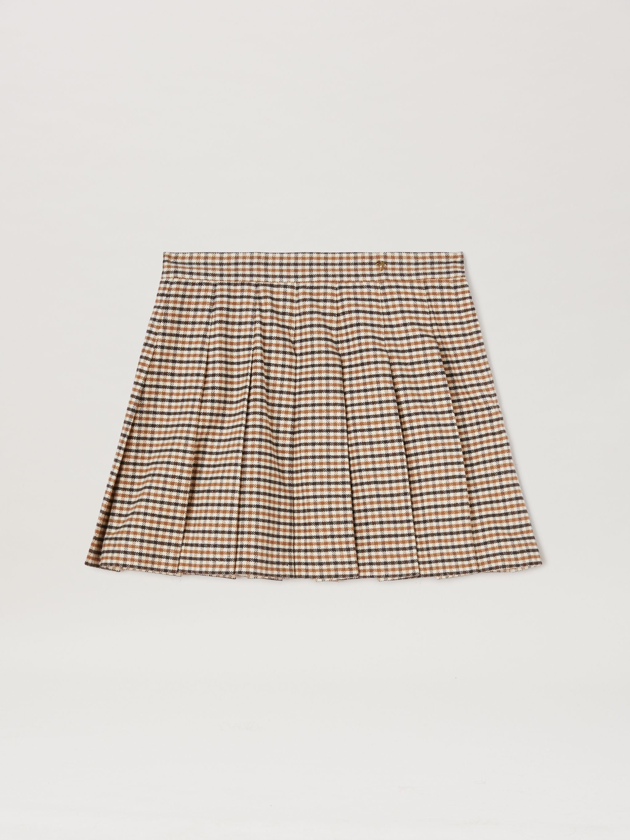 Women's college-style pleated checkered miniskirt in shades of brown with button waist. FABRIC 70% COTTON 30% POLYESTER MODEL ERIKA WEARS SIZE 40 HEIGHT: 5'7" (175 CM) BUST: 31" (79 CM) WAIST: 23" (58 CM) HIPS: 34" (86 CM) PRODUCT ID: PWCU005F23FAB0016061