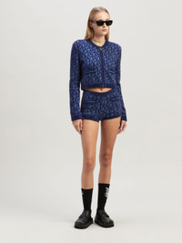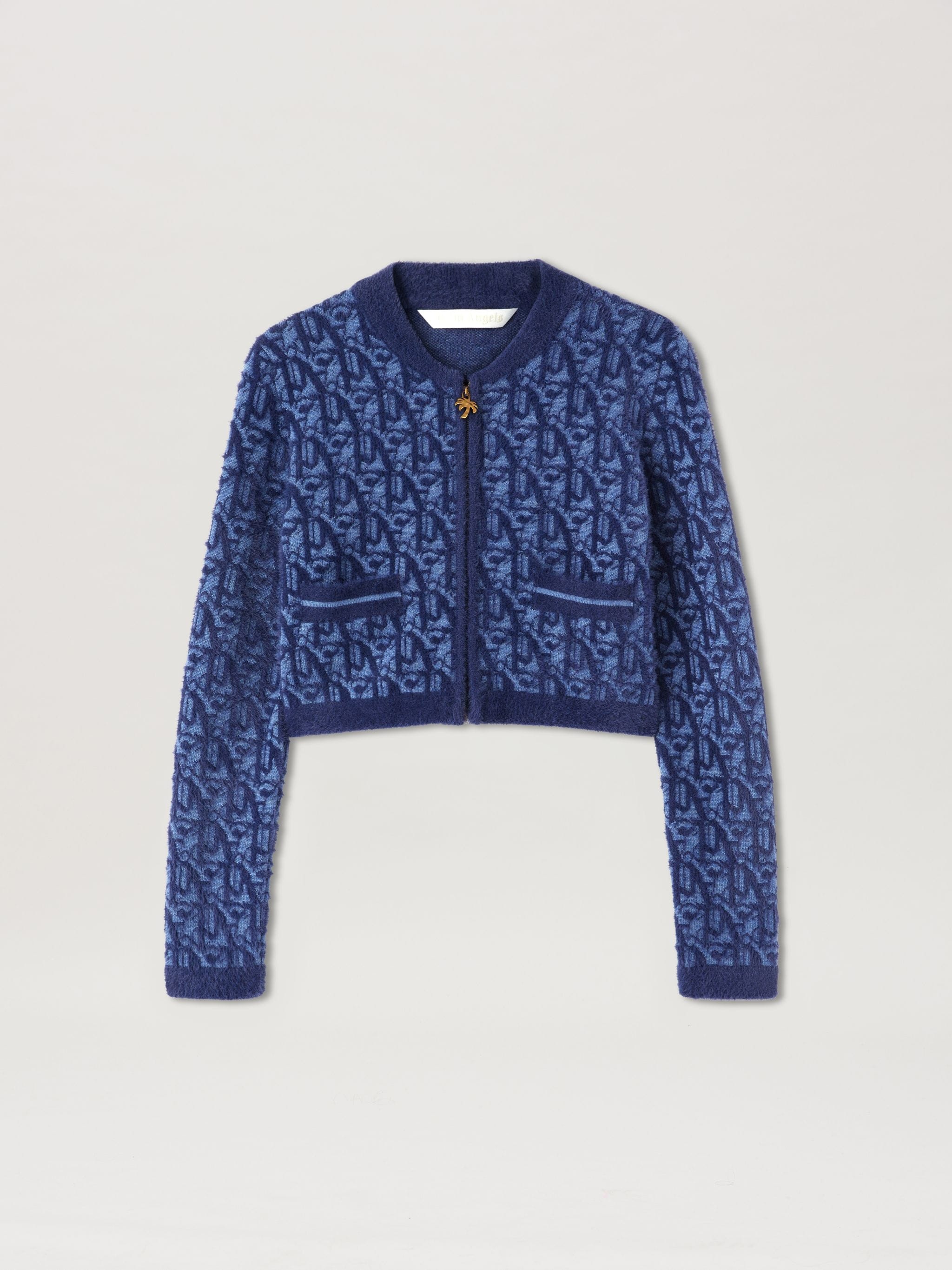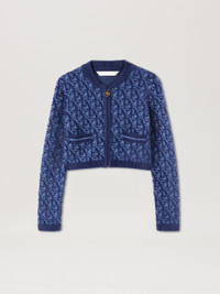 Some street and chic take on knits. Women's short cardigan with blue-on-light blue jacquard Monogram, blue piping and blue-and-light blue striped pockets on front. Zipper closure and golden palm tree-shaped zipper pull. Ebba wears size S Height: 5' 10" (178 cm) Bust: 31" (79 cm) Waist: 23" (60 cm) Hips: 35" (89 cm) PRODUCT ID: PWHB027R24KNI0014045
