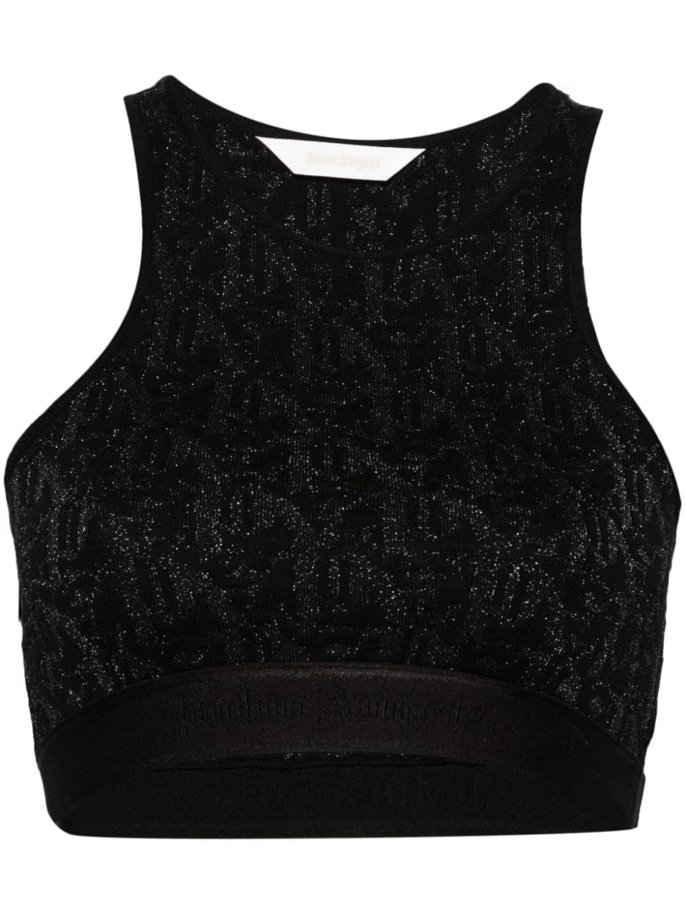 monogram-jacquard crop top It would be hard to notice the monogram jacquard on this black Palm Angels top were it not woven in shimmering Lurex threads. It’s cut to a sporty racerback silhouette with an elasticated logo band at the cropped hem. Highlights - Black - Knitted construction - Metallic threading - Monogram jacquard - Crew neck - Sleeveless - Elasticated logo hem - Racerback - Cropped Made in Italy Composition Viscose 88%, Polyester 11%, Polyamide 1% SIZE & FIT Model measurements Height 5 ft 11 in(1.8 m) Bust/Chest 33.07 in(84 cm) Hips 37.4 in(95 cm) Waist 25.19 in(64 cm) FittingInformation Designed for a close fit throughout The elasticated waist allows for a comfortable fit Made from a midweight fabric This piece fits true to size – take your usual size Washing instructions Hand Wash