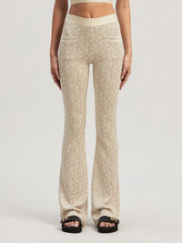 A street and chich take on knits. Women's slim fit knit pants with jaquard Mongram in gold and white, with elastic waistband and gold and white striped pockets on front. Ebba wears size S Height: 5' 10" (178 cm) Bust: 31" (79 cm) Waist: 23" (60 cm) Hips: 35" (89 cm) PRODUCT ID: PWHG026R24KNI0010361