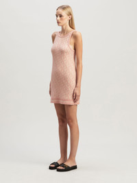 A street and chic take on knits. Women's knit mini dress with Monogram jaquard in pink and white pink piping and straps, and pink and white striped hem. Ebba wears size S Height: 5' 10" (178 cm) Bust: 31" (79 cm) Waist: 23" (60 cm) Hips: 35" (89 cm) PRODUCT ID: PWHI044R24KNI0016130