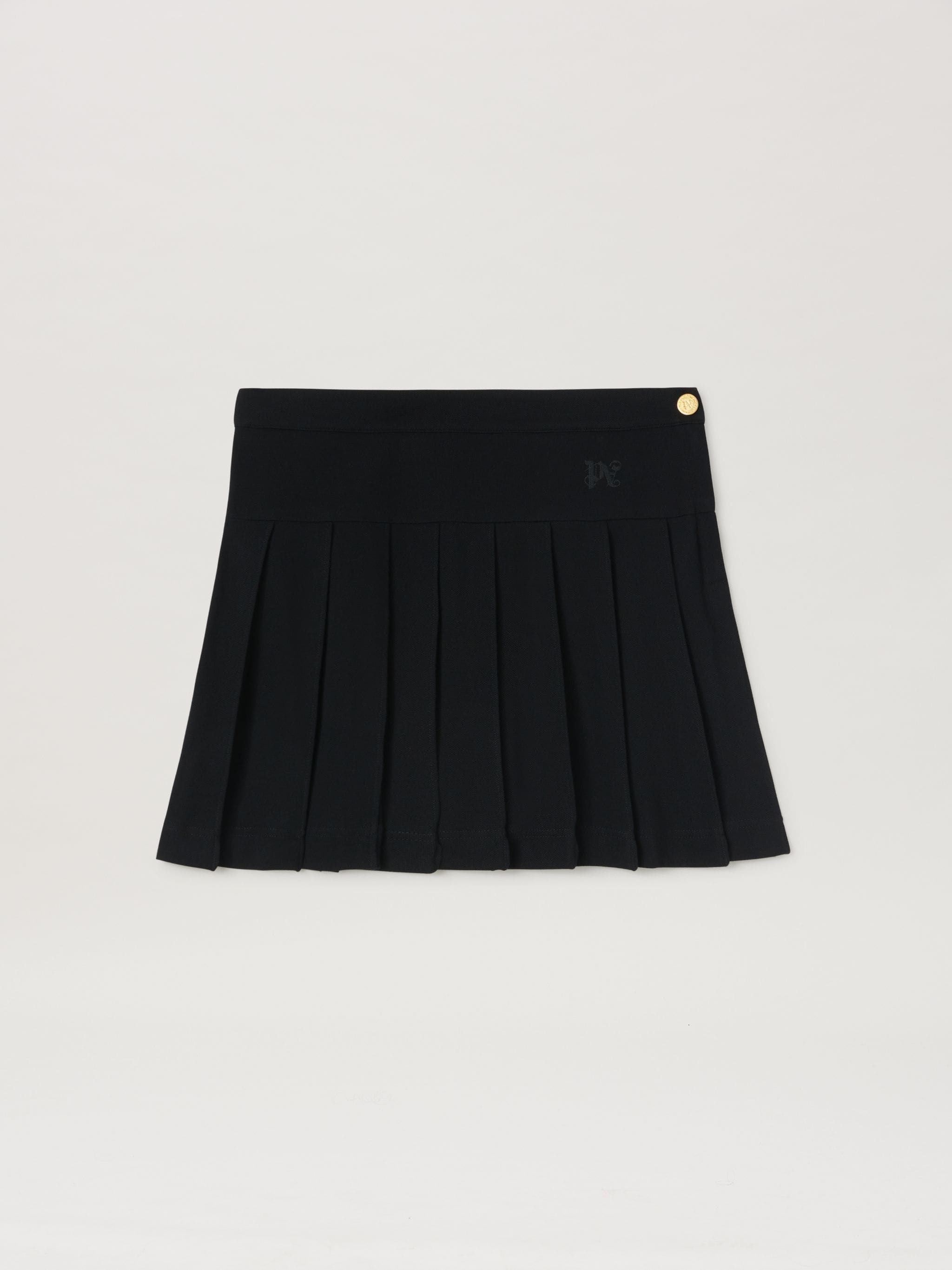 Women's black pleated mini skirt closed by a gold button and with Monogram embroidered on the front. PRODUCT ID: PWCC070S24FAB0011010
