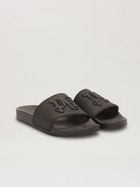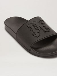Black rubber pool slider, with ergonomic footbed, wide band with engraved profiles and emossed Palm Angels Monogram. Sole with non-slip details. sole 100% POLYURETHANE upper shoe 100% POLIURETANO TERMOPLASTICO PRODUCT ID: PMIC010E23PLA0011010