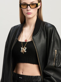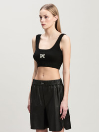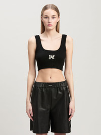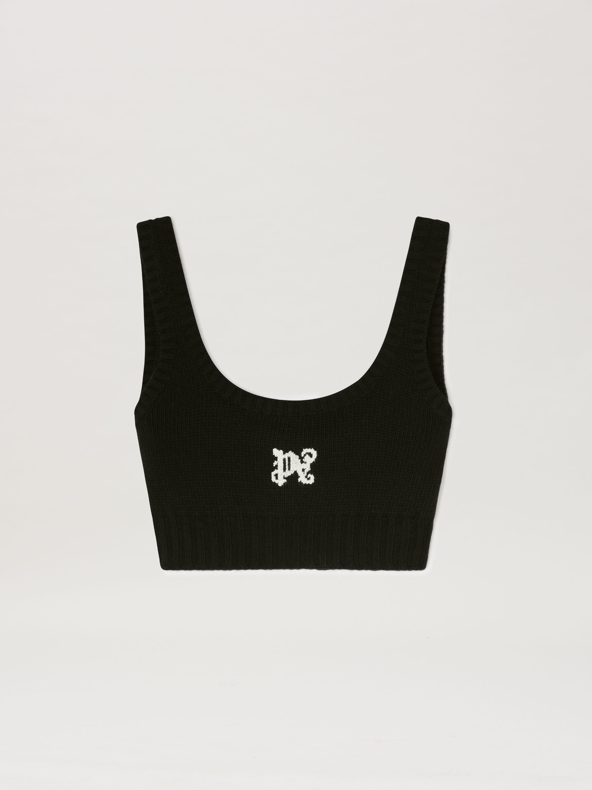 Knitwear with a handmade touch and a street feel. Women's cropped tank top in black knit, with ribbed hem and Monogram embroidery in white on the front. Ebba wears size S Height: 5' 10" (178 cm) Bust: 31" (79 cm) Waist: 23" (60 cm) Hips: 35" (89 cm) PRODUCT ID: PWHR003F24KNI0021003