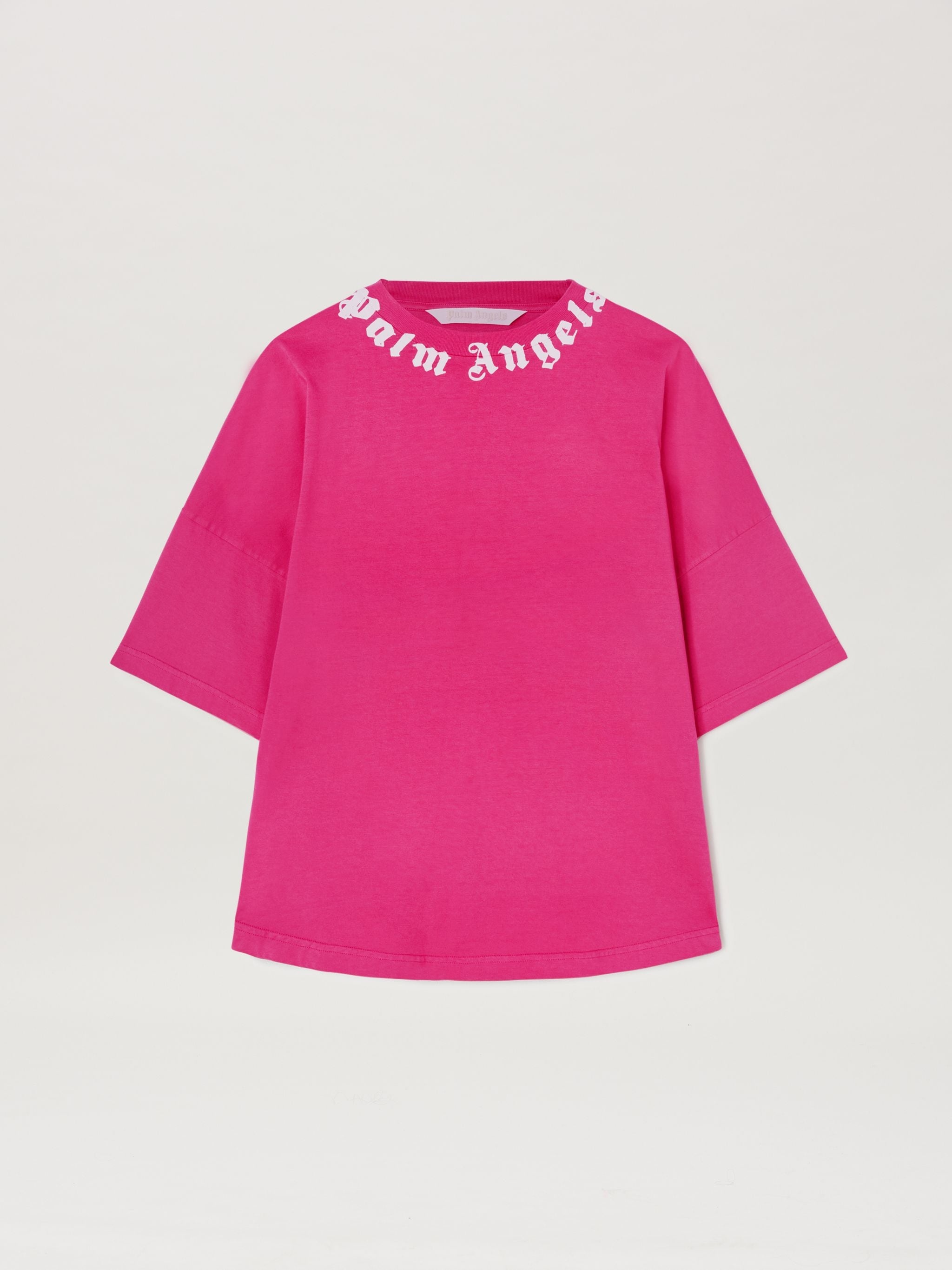 Logo augmented by new placements and fresh paint effect. Women's fuchsia oversize T-shirt with Palm Angels logo hand printed in white around the neck. FABRIC 100% COTTON - RIB DETAIL 100% COTTON STEFFI WEARS SIZE S HEIGHT: 5' 11" (180 CM) BUST: 32" (81 CM) WAIST: 23" (59 CM) HIPS: 35" (89 CM) PRODUCT ID: PWAA023F24JER0013203