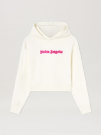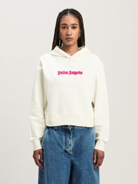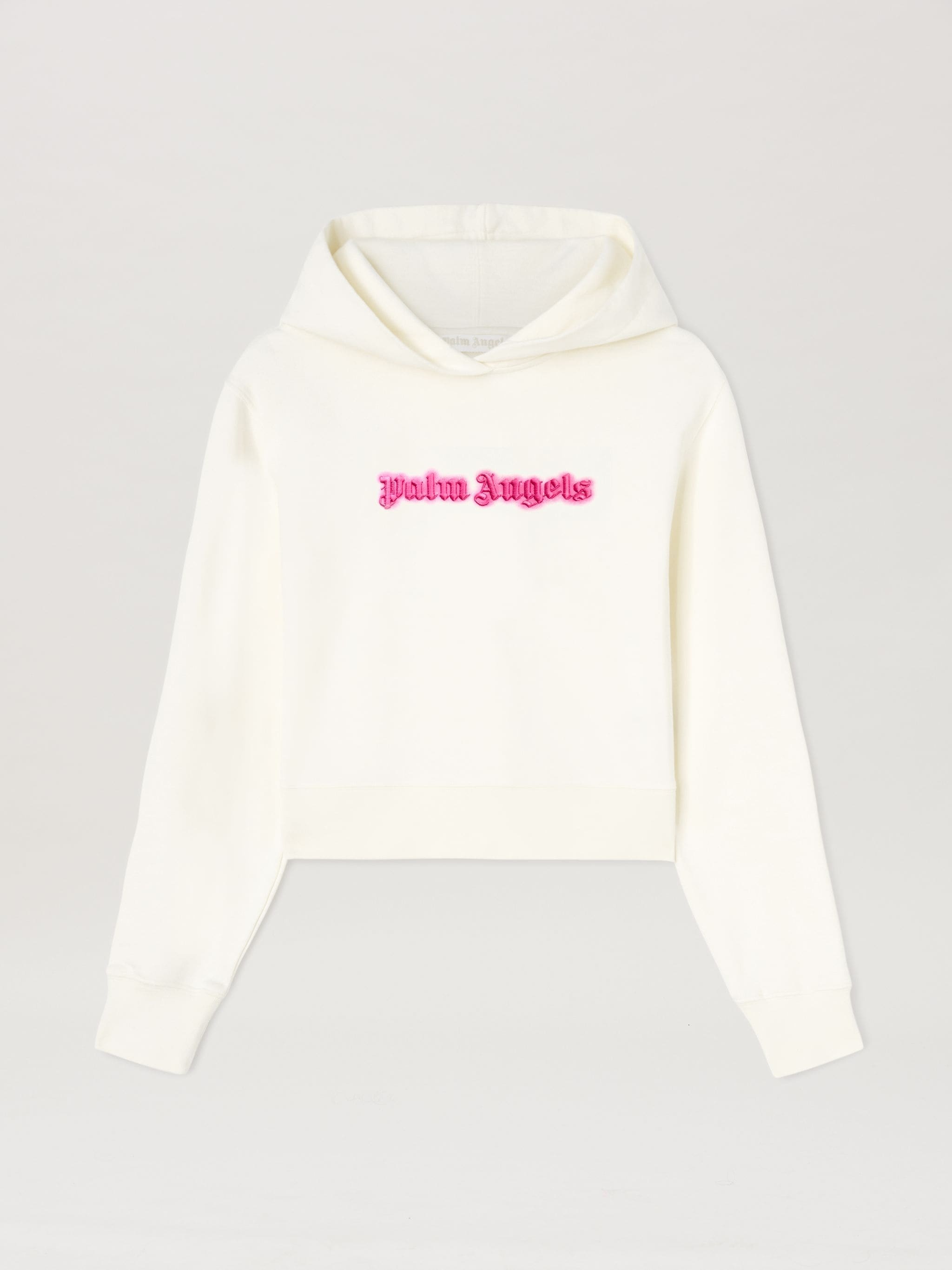 Logo variants with unique visual and tactile effects. Women's white fitted hoodie with fuchsia Palm Angels logo embroidered with neon effect print on front. LAURE WEARS SIZE S HEIGHT: 5' 9" (177 CM) BUST: 30" (78 CM) WAIST: 23" (60 CM) HIPS: 35" (87 CM) PRODUCT ID: PWBB069F24FLE0040332