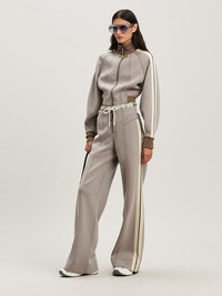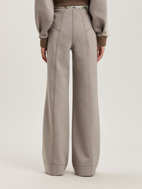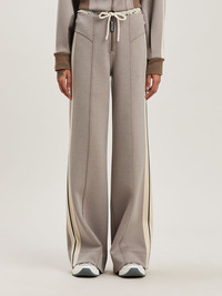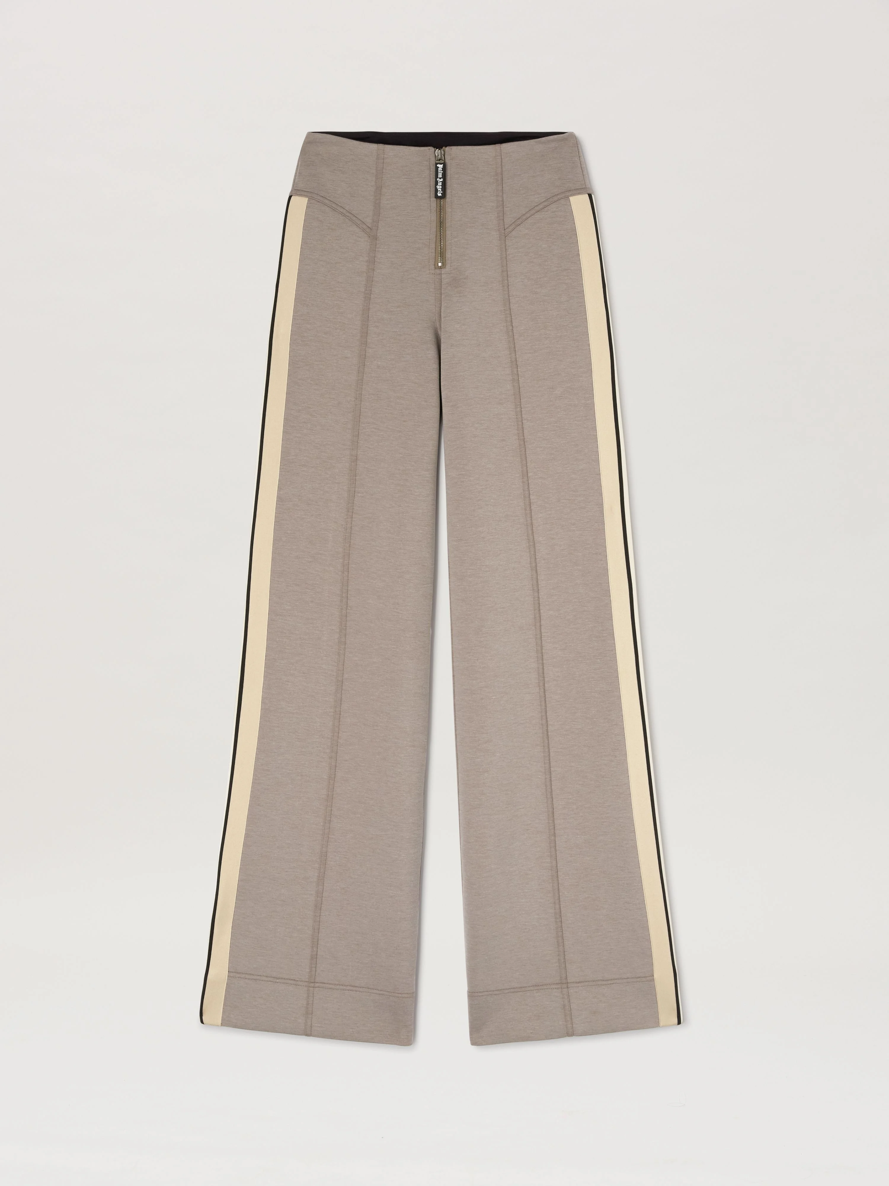 Technical fabric giving leisure garments a sculptural elegance. Women's taupe neoprene track pants, with heigh waist, wide legs and iconic Tape on sides. PRODUCT ID: PWCA153S25FAB0016C03