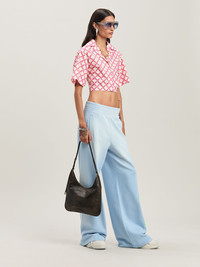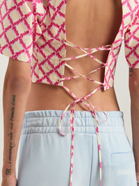 The new pattern of SS25 is a grid resulting by playing with the Classic logo through repetitions and intersections. Women's short sleeves cropped shirt with crisscrossed back, featuring fuchsia Net logo print on ivory background. DETAILS - Detail 100% BrassFabric 100% Cotton - Code: PWGG007S25FAB0010B32