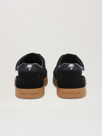 Revisited retro silhouette with a subtle color scheme. Men's black suede sneaker with caramel-colored sole, elongated white palm tree stitched on the side, and reinforced back with white palm tree. PRODUCT ID: PMIA099S25LEA0021001